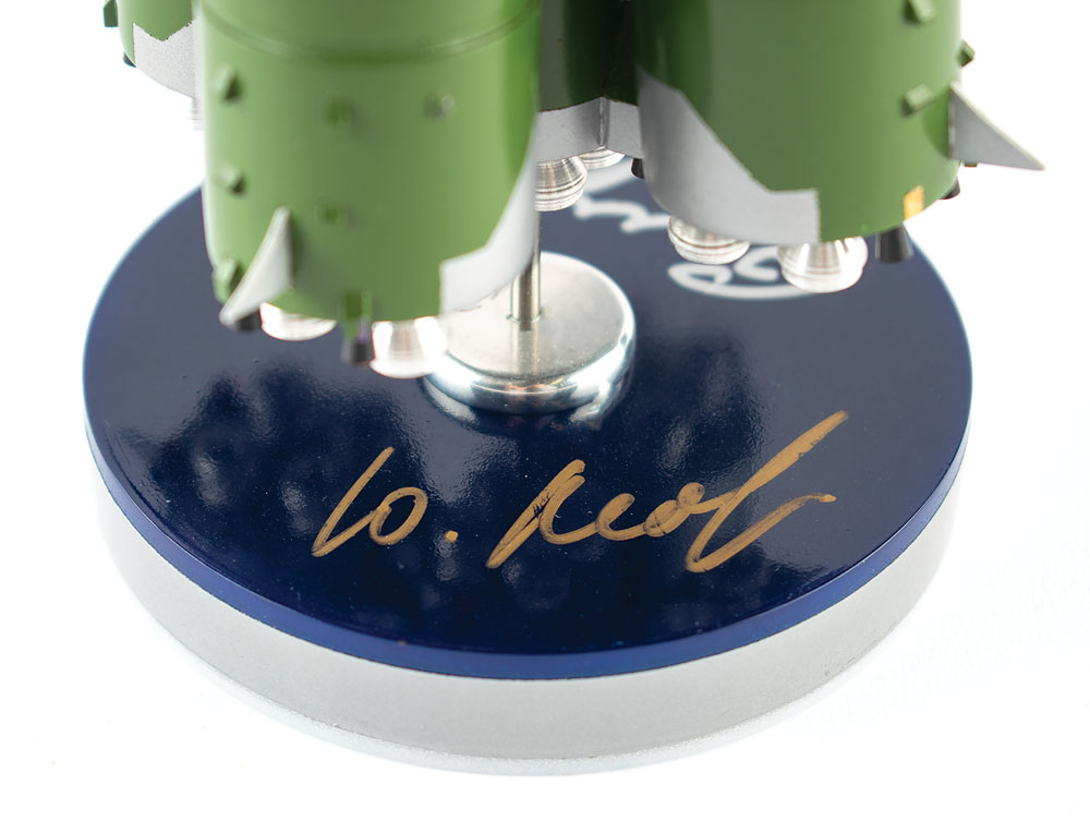 High-quality hand-made presentation model of a Soyuz rocket by Energia, measuring an overall 20″ tall on a 3.5″ diameter base, signed on the base in ink by cosmonauts Yuri Malenchenko and Sergei Zalyotin. In fine condition.