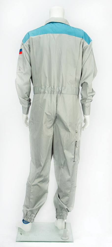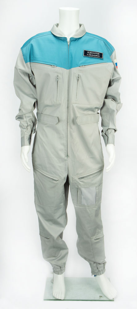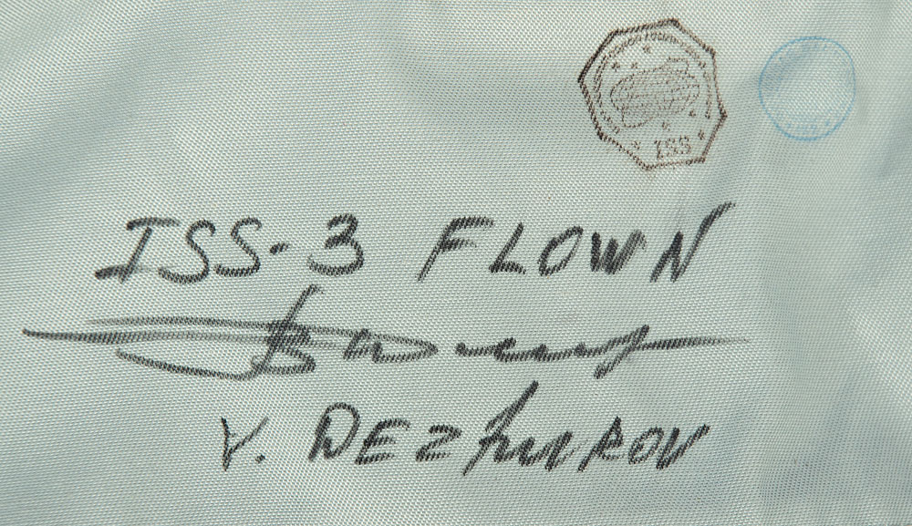 Vladimir Dezhurov's flown suit worn on the International Space Station during Expedition 3, featuring a zip-up front, Russian flag patch on the left shoulder, and bilingual name patch in Cyrillic and English, "V. Dezhurov." Signed inside the neck area in black felt tip, "ISS-3 Flown, V. Dezhurov," with two ISS ink stamps above, done in-flight onboard the station. The gray-and-teal jumpsuit has several additional zippered pockets and pouches on the arms and legs. In fine condition.