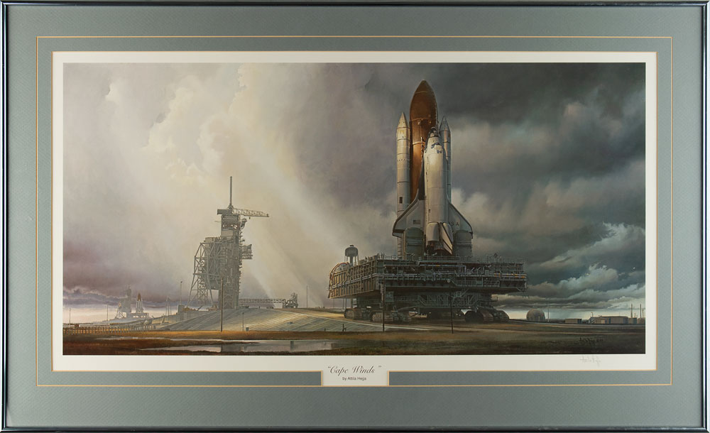 Color 30 x 16.5 lithograph entitled 'Cape Winds,' showing Space Shuttles being prepared for launch at Pads 39A and B, signed in the lower corner in pencil by artist Attila Hejja. Matted and framed to an overall size of 35.25 x 21.5. In fine condition.