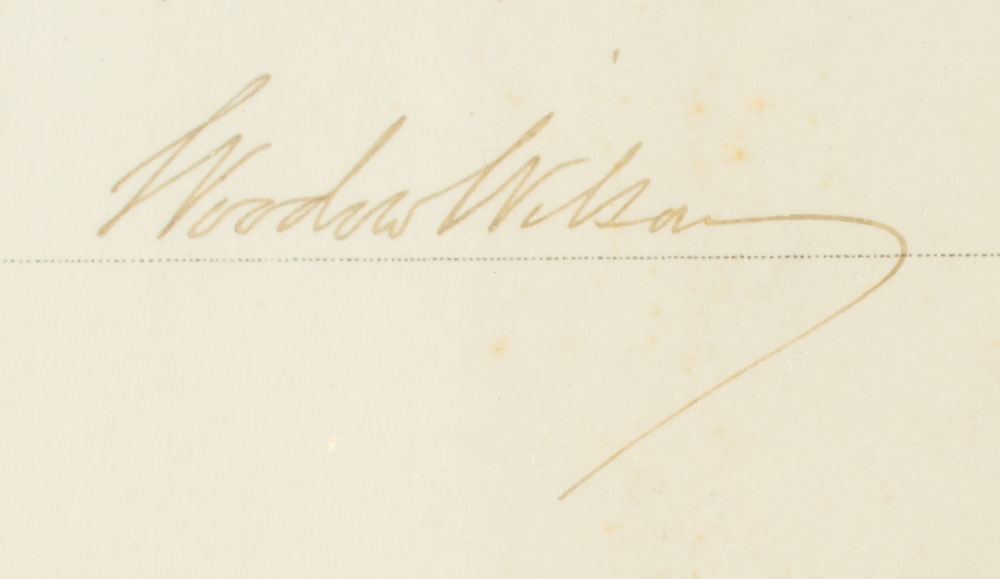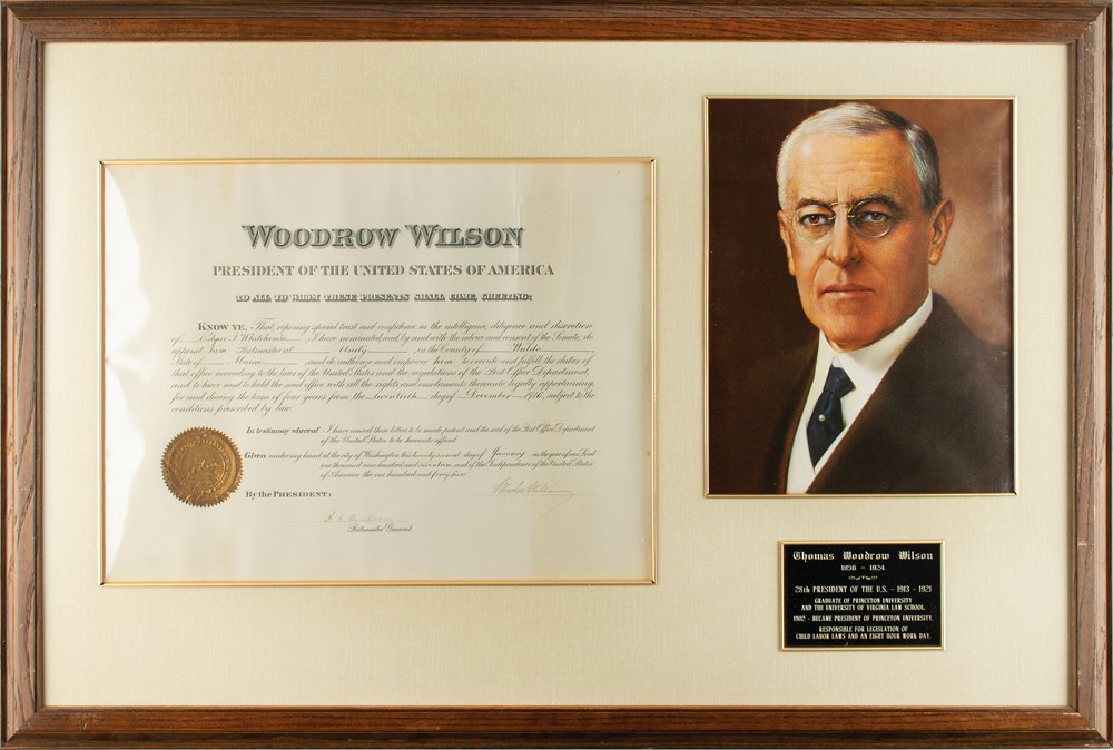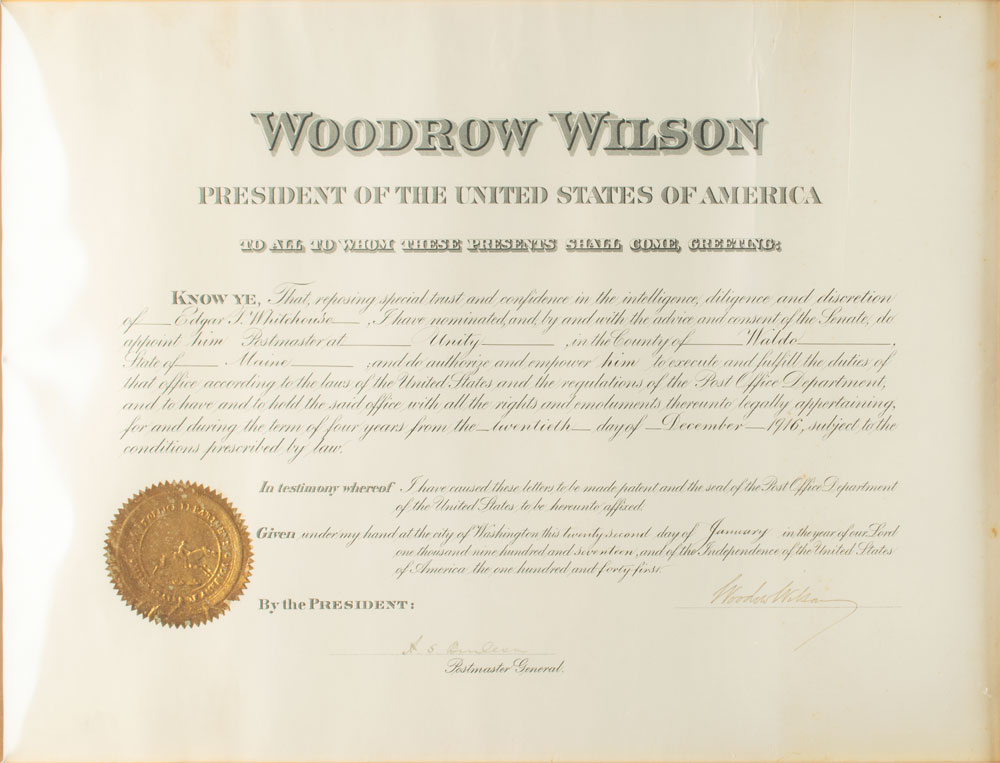 Partly-printed DS as president, one page, 17.75 x 13.5, January 22, 1917. President Wilson appoints Edgar J. Whitehouse as "Postmaster at Unity, in the County of Waldo, State of Maine." Signed at the conclusion by Woodrow Wilson, and countersigned by Postmaster General Albert S. Burleson. Gold foil seal remains affixed to the lower left. Cloth-matted and framed with an engraved plaque and a large color portrait to an overall size of 36.5 x 24.5. In very good to fine condition, with light staining to the top edge, and several vertical creases to the upper right.