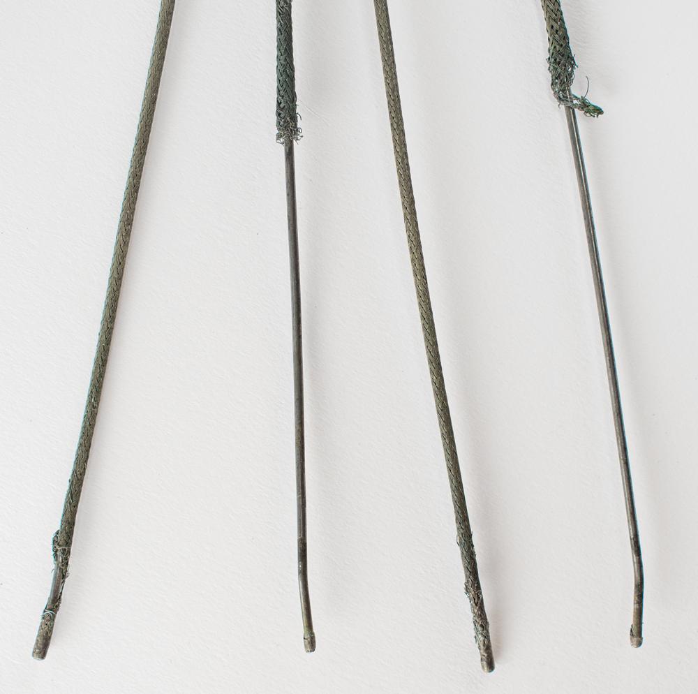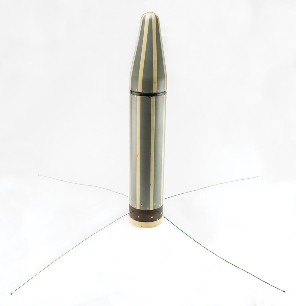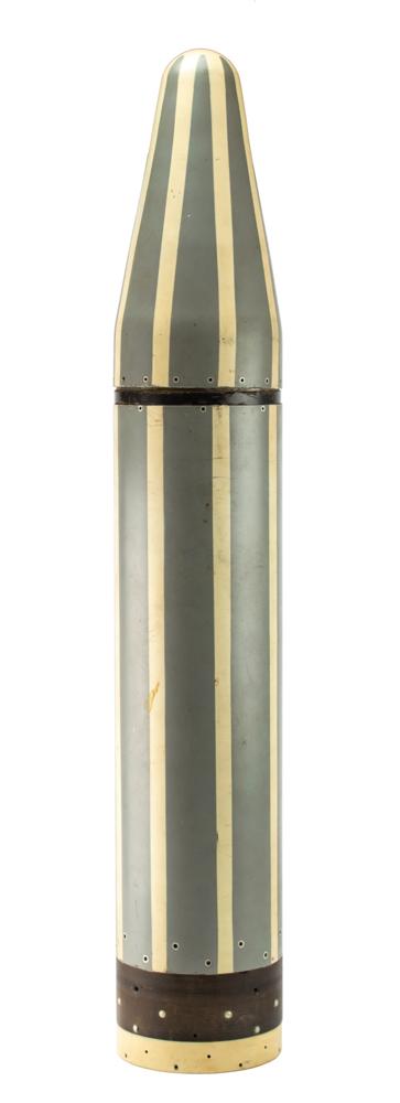 Impressive historic mockup of the nose cone/payload carrier for the Explorer 1 satellite fabricated and used by the Jet Propulsion Laboratory and the Army Ballistic Missile Agency (ABMA) Fabrication & Advanced Engineering (F&AE) Laboratory in conjunction with the first successful U.S. orbital satellite program. The heavy metal three-piece nose cone stands an impressive 37.25 ̋ in height with a diameter of 6.25 ̋, weighs approximately 16.5 lbs, and includes a set of four flexible coil-wound whips with weighted tips, which comprised the turnstile antenna, each antenna element is 28 ̋ in length; the base is marked in yellow paint, “F&AE Lab.” Includes its original wooden carrying case, 40 ̋ x 8 ̋ x 7.5 ̋, with the upper lid stenciled “Nose Cone & Payload,” and marked in yellow paint, “F&AE Lab.” In very good condition, with scattered scuffing and marks; case features heavy wear, with screws to handle stripped.