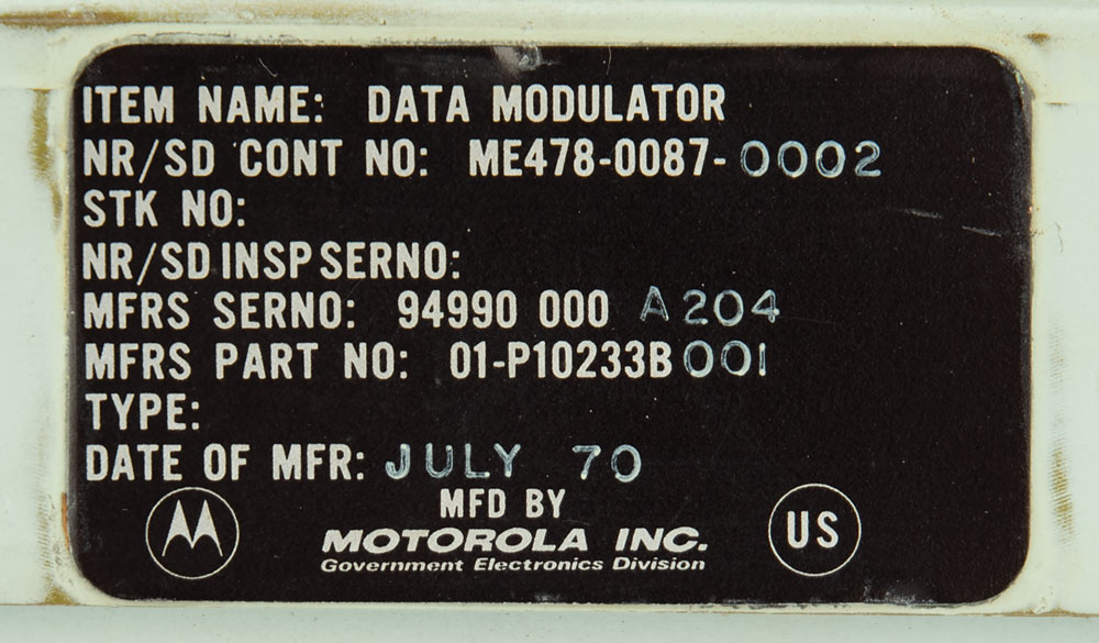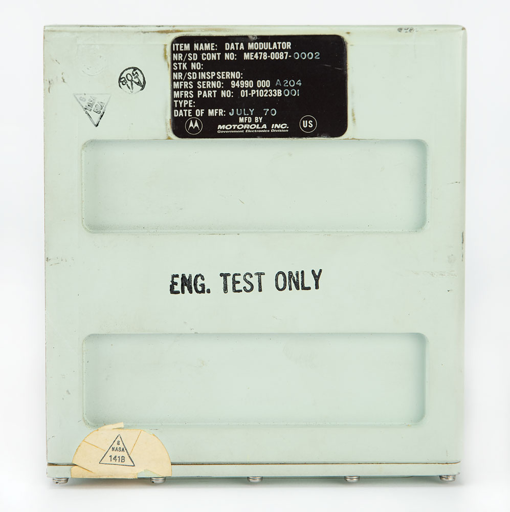 Apollo Command Module (Block II) Data Modulator, measuring 4.25″ x 4.5″ x 8.25″, with a Motorola label on the side, reading: "Item Name: Data Modulator, NR/SD Cont No: ME478-0087-0002?Date of Mfr: July 70." There is a NASA inspection stamp near the tag and a white NASA seal over the bottom plate. The sides are stenciled "Eng. Test Only," and one side has ports marked "J1" and "J2." In fine condition.