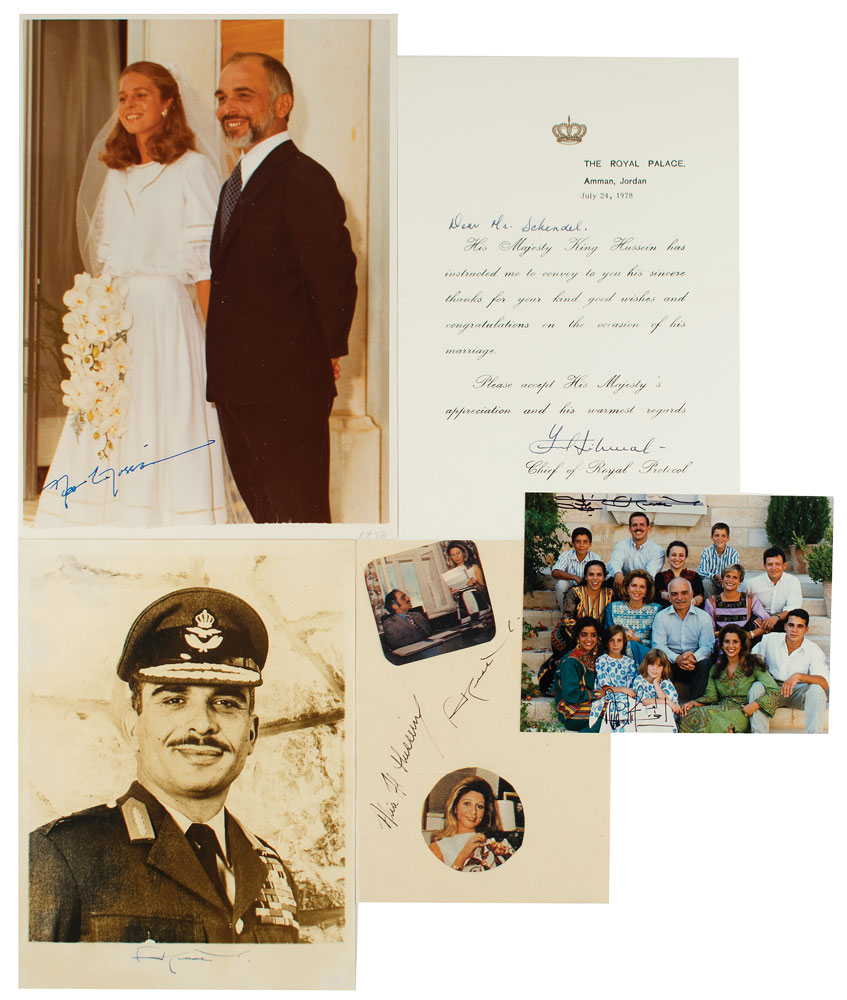 Group of items signed by the royal family of Jordan, including: a photo signed by King Hussein; a photo signed by King Hussein and Queen Noor; signatures of King Hussein and Queen Alia on an off-white sheet; a photo signed by Queen Noor. Also includes a 1978 invitation to the Royal Palace signed by the chief of royal protocol. In overall fine condition, with two horizontal folds to the signed sheet.