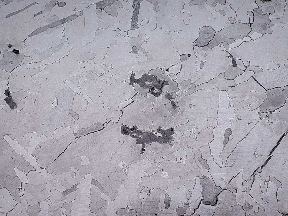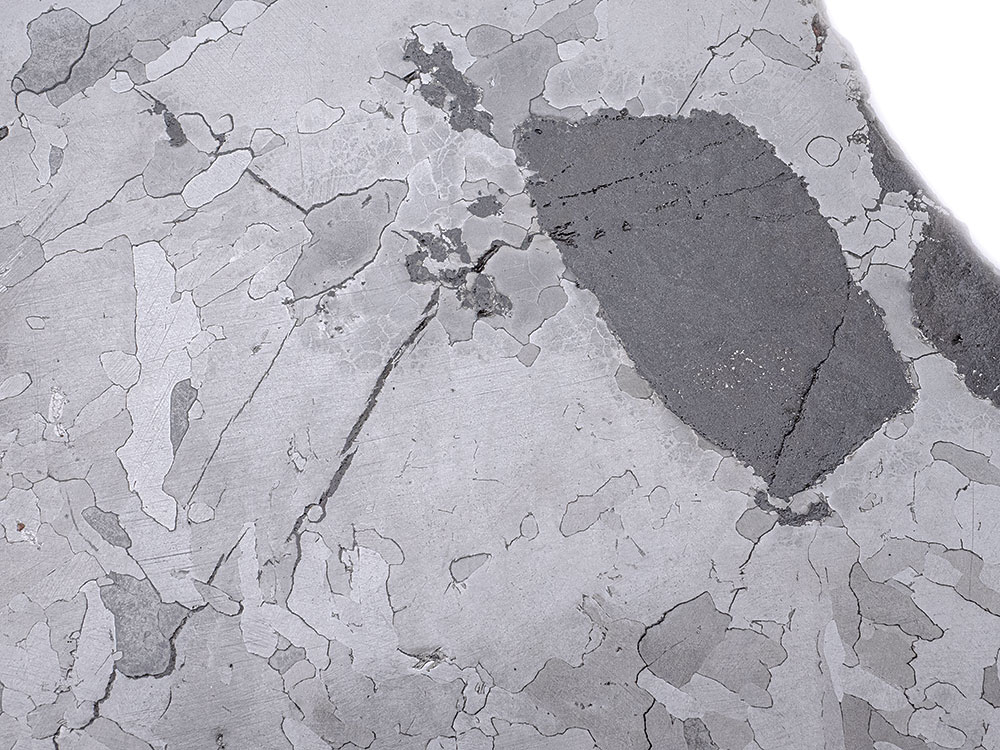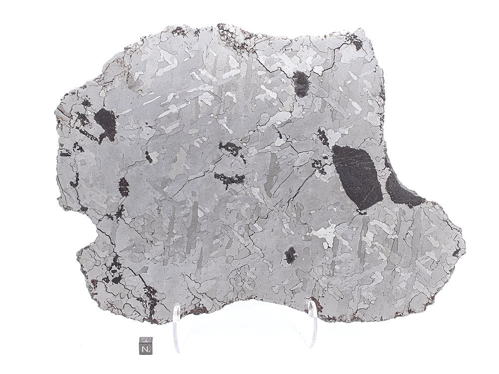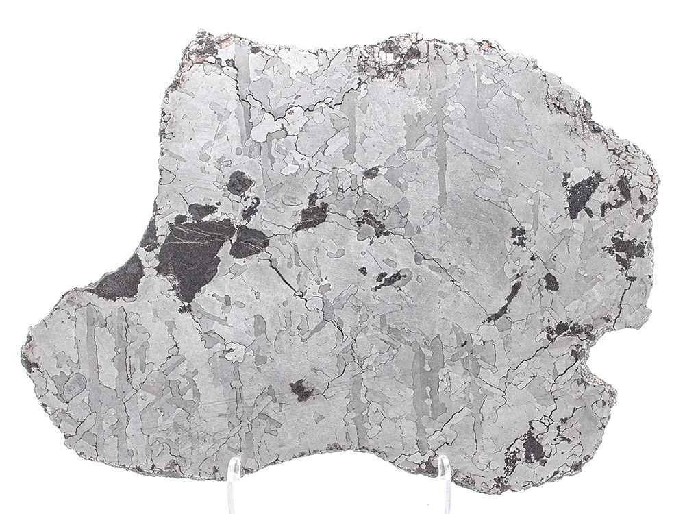 Huge Campo del Cielo iron meteorite slice, etched and polished on both faces to reveal a handsome Widmanstätten pattern as well as black silicate-graphite-troilite inclusions. The full slice weighs 2,046 grams and measures approximately 314 mm x 223 mm x 4 mm (12.36″ x 8.77″ x 0.15″ or 31.4 cm x 22.3 cm x .4 cm). Campo del Cielo is a class IAB iron meteorite, comprised of about 93% iron and 6.7% nickel, plus small amounts of trace elements including gallium, germanium, cobalt, and iridium. The impact is believed to have occurred approximately 5,000 years ago. The Campo strewnfield is roughly 18 km (11 miles) in length and includes at least 25 distinct craters. It is one of the larger known strewnfields on Earth, and perhaps the single biggest crater field. It is also one of the largest impacts from which actual meteorite specimens have been recovered.