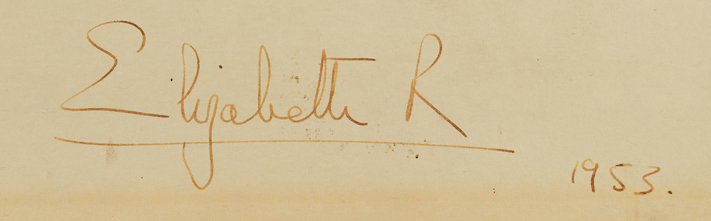 Resplendent oversized matte-finish 18.75 x 23.25 portrait of Queen Elizabeth II seated and wearing her glimmering crown jewels by Royal Court photographer Dorothy Wilding, affixed to its original 20.25 x 26 studio mount, neatly signed on the mount in fountain pen, "Elizabeth R, 1953." Reverse of the mount bears Wilding's studio label, which is numbered in pencil: “015957, J.” In fine condition, with some light toning from prior display. An absolutely stunning portrait of the queen—the largest that we have ever offered.