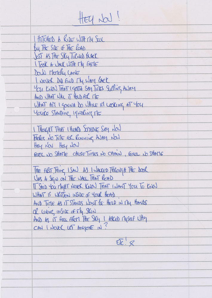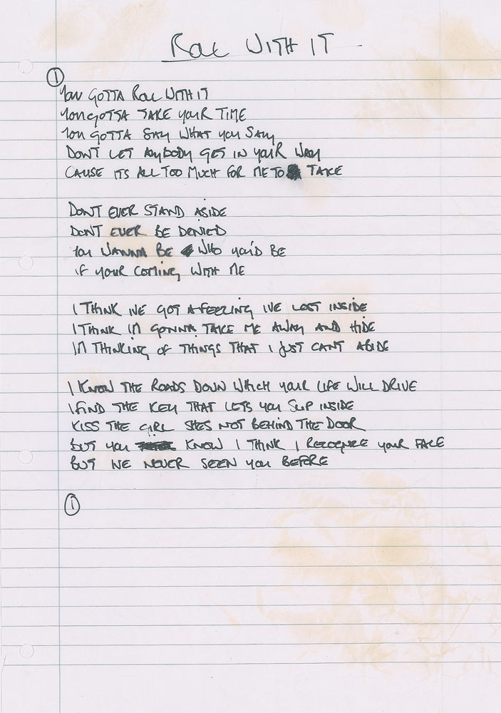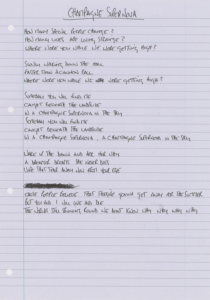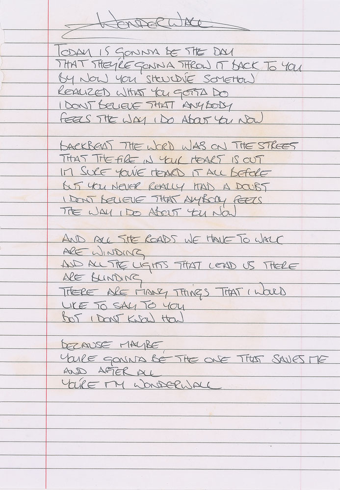 Spectacular complete set of handwritten lyrics by Noel Gallagher for (What's the Story) Morning Glory?, the landmark second studio album from English rock band Oasis. Used in Rockfield Studios for rehearsals and during recording in March-June of 1995, the lyrics are penned in various colored ink and felt tip on 11 off-white sheets, each approximately 8.25 x 11.5, and include the following song titles: ‘Hello,’ ‘Roll with It,’ ‘Wonderwall,’ ‘Don't Look Back in Anger,’ ‘Hey Now!,’ ‘Bonehead's Bank Holiday,’ ‘Some Might Say,’ ‘Cast No Shadow,’ ‘She's Electric,’ ‘Morning Glory,’ and ‘Champagne Supernova.’ In overall very good to fine condition, with overall creasing to all of the pages, and varying degrees of staining to about half of the pages. Accompanied by certificates of authenticity from Tracks for each individual lyric sheet, as well as one for the entire collection.