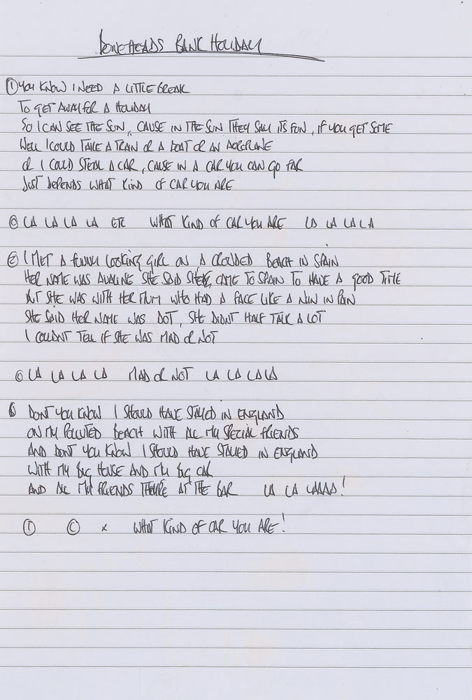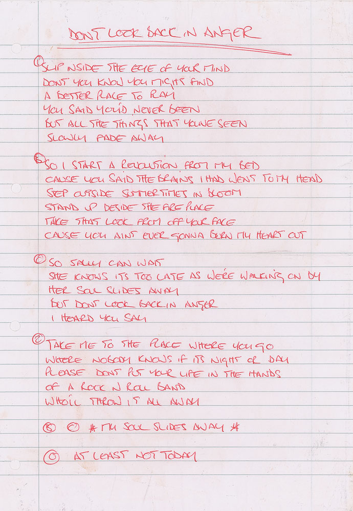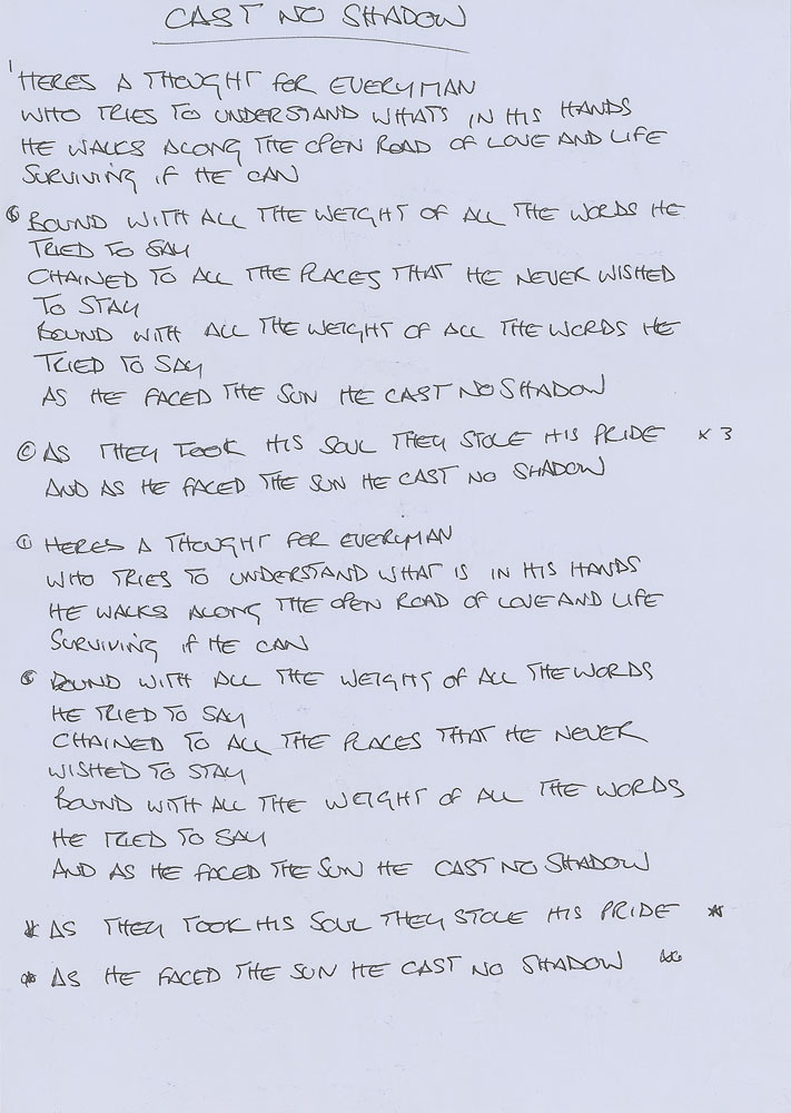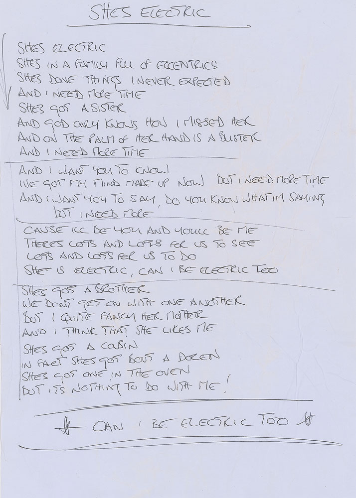 On the strength of major hit singles ‘Wonderwall,’ ‘Champagne Supernova,’ and ‘Don't Look Back in Anger,’ (What's the Story) Morning Glory? promptly elevated Oasis from a fledgling indie rock group to bona fide international rock stars in the fall of 1995. Gallagher’s focus on balladry and arena-rousing anthems proved a winning follow-up to their debut Definitely Maybe. The album’s overarching appeal proved indisputable and, ultimately, unstoppable; to date, the album has sold over 22 million copies worldwide, making it the UK's fifth best-selling album of all time. (What's the Story) Morning Glory? is regarded as a seminal entry of the British pop scene, and has appeared in several publications as one of the greatest albums of all time. Used in the studio and personally handwritten by the principal songwriter of Oasis, these lyrics—which include ‘Bonehead's Bank Holiday,’ released as an exclusive vinyl bonus—represent the sound and voice of the leading, most influential act of the Britpop movement. This year marks the 25th anniversary of this historic album’s release. As a complete set, these lyrics are of astounding appeal.