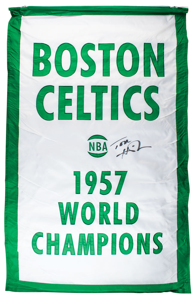 Large green-and-white vinyl banner for the Boston Celtics, 36 x 57.5, honoring the team's NBA world championship in 1957, signed in black felt tip by Hall of Famer Tommy Heinsohn, who won Rookie of the Year in 1957. Rolled and in fine condition.