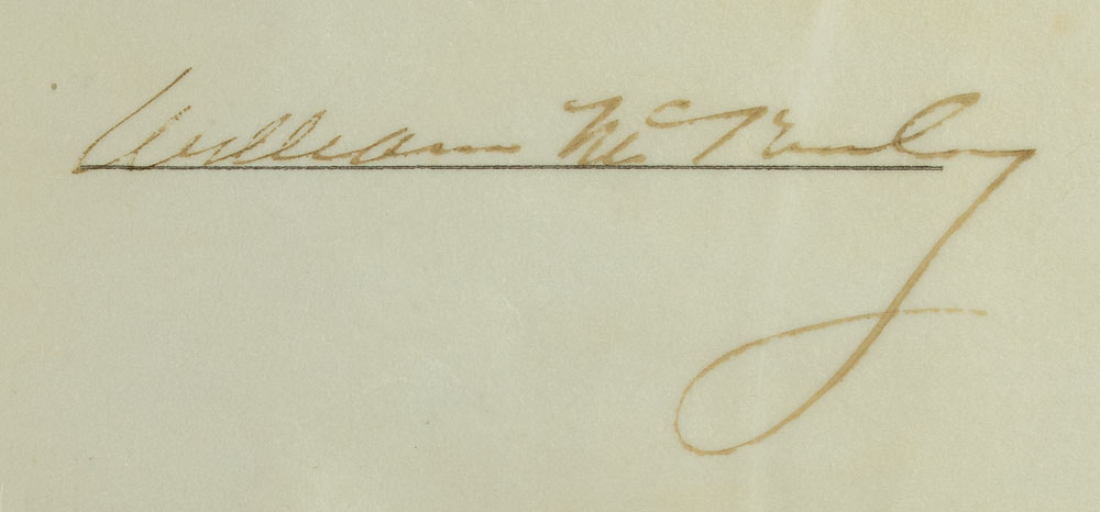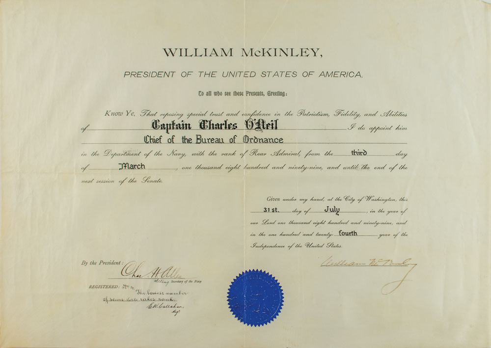 Partly-printed vellum DS as president, one page, 20.5 x 14.5, July 31, 1899. President McKinley appoints Captain Charles O'Neil as "Chief of the Bureau of Ordnance in the Department of the Navy, with the rank of Rear Admiral." Signed at the conclusion by William McKinley, and countersigned by Acting Secretary of the Navy Charles Herbert Allen. The blue Navy Department seal remains affixed to lower portion. In very good to fine condition, with intersecting folds, light edge creasing, and scattered tiny holes. Charles O’Neil’s naval career was lengthy and spectacular and marked with notable episodes of heroism throughout the Civil War. An expert in naval ordnance, O’Neil became superintendent of the naval gun factory at the Washington naval yard; he played a key role in developing the modern U. S. Navy.