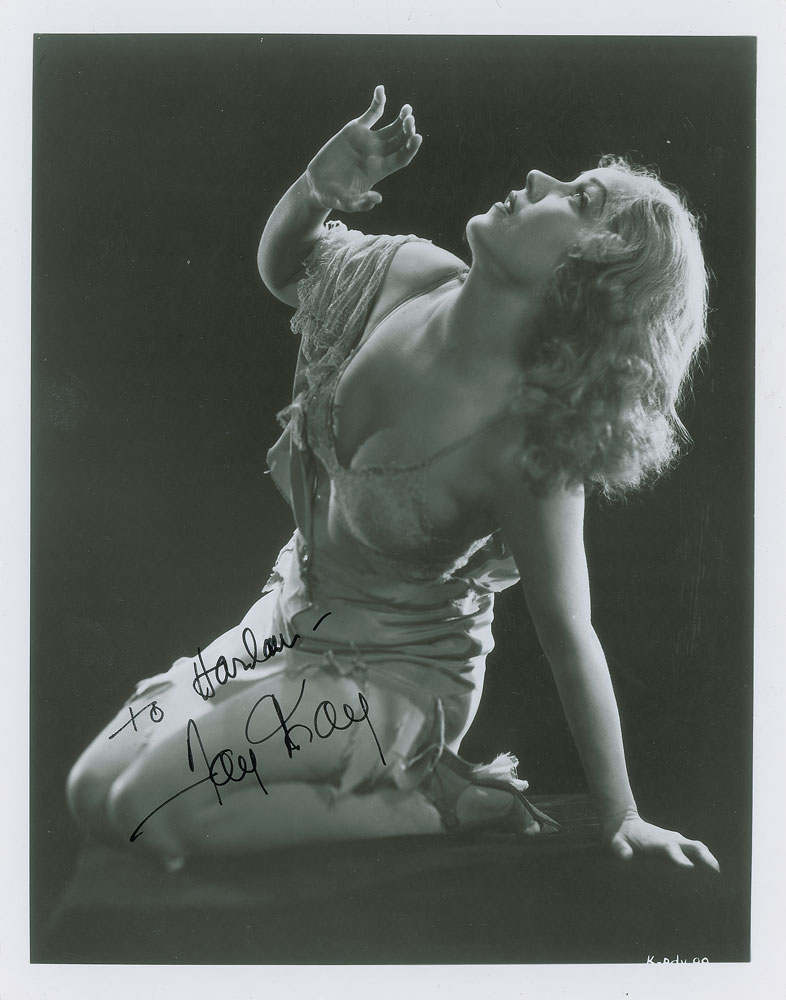 Glossy 8 x 10 full-length photo of Wray during a dramatic promo shoot for King Kong, signed and inscribed in thin black felt tip, "To Harlan—Fay Wray." In fine condition.