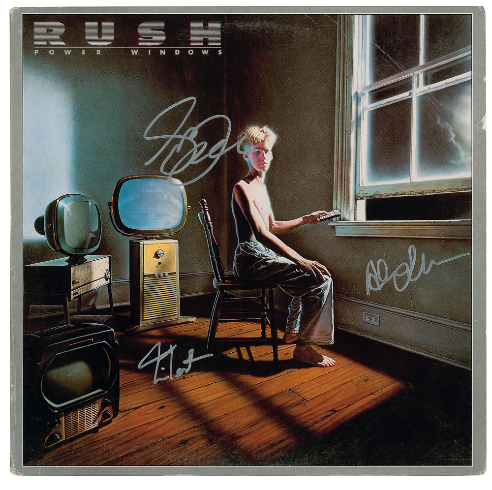Power Windows album by Rush, signed on the front cover in silver ink by Geddy Lee, Alex Lifeson, and Neil Peart. In very good to fine condition, with creasing to the upper right corner. The record is not included.