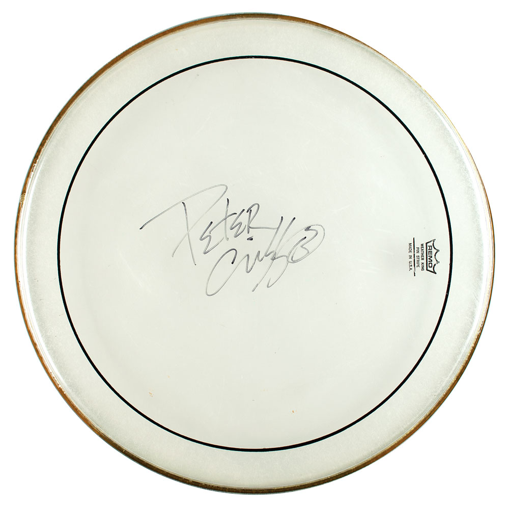 Transparent Remo Weather King drumhead, 18.5″ in diameter, used on stage by KISS drummer Peter Criss, who signs in black felt tip. In fine condition, with expected marks and wear from use.