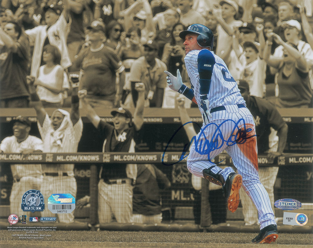 Choice color satin-finish 10 x 8 photo of Derek Jeter rounding the bases, signed in blue felt tip. In very fine condition, with Steiner and MLB authentication holograms affixed to the corner.