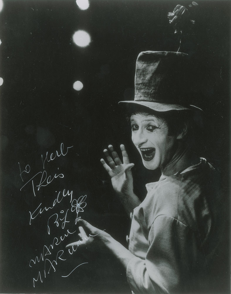Glossy 8 x 10 photo of the famous French mime in an excited half-length pose, signed and inscribed in white ink, "To Herb Theis, Kindly, Bip, Marcel Marceau," who adds a small flower sketch. In fine condition.