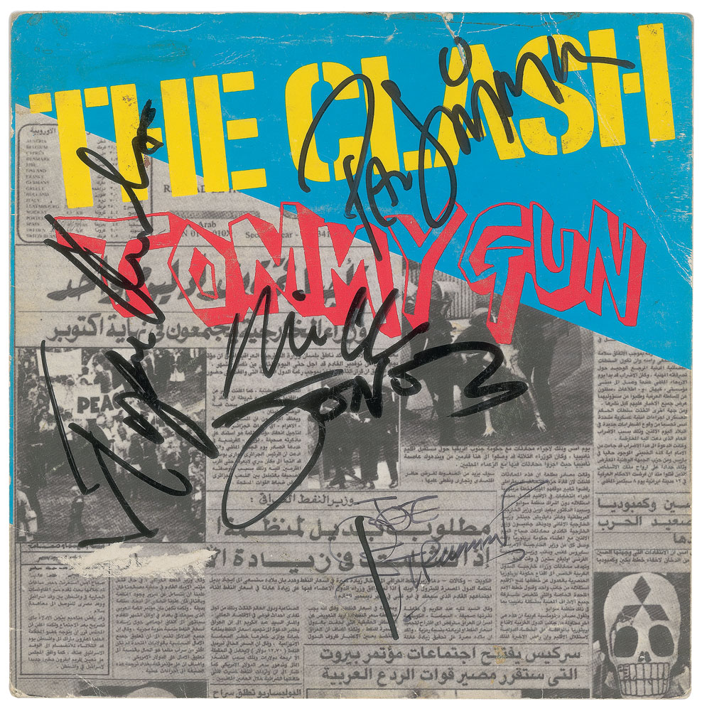 CBS Records 45 RPM single record for 'Tommy Gun / 1-2 Crush on You' by The Clash, signed on the front cover in black felt tip by Joe Strummer, Mick Jones, Paul Simonon, and Topper Headon. In very good to fine condition, with some edge and corner creasing, and one small area of scuffing. The record is not included. Accompanied by a full letter of authenticity from REAL.