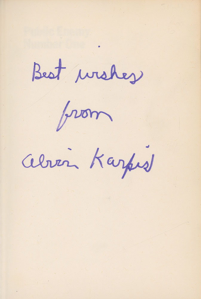 Signed book: Public Enemy Number One: The Alvin Karpis Story. First edition. Toronto: McClelland and Stewart Limited, 1971. Hardcover with dust jacket, 6 x 8.5, 256 pages. Signed on the first free end page in purple felt tip, "Best wishes, from Alvin Karpis." In fine condition, with toning and wear to the dust jacket, and the price clipped from the front flap.
