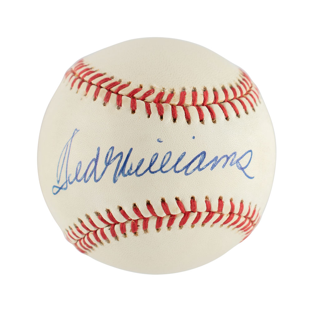 Official Rawlings American League (Brown) baseball signed in blue ballpoint on the sweet spot by Ted Williams. In fine condition.