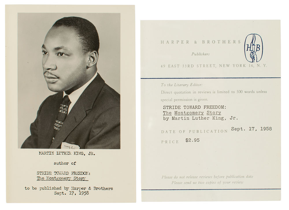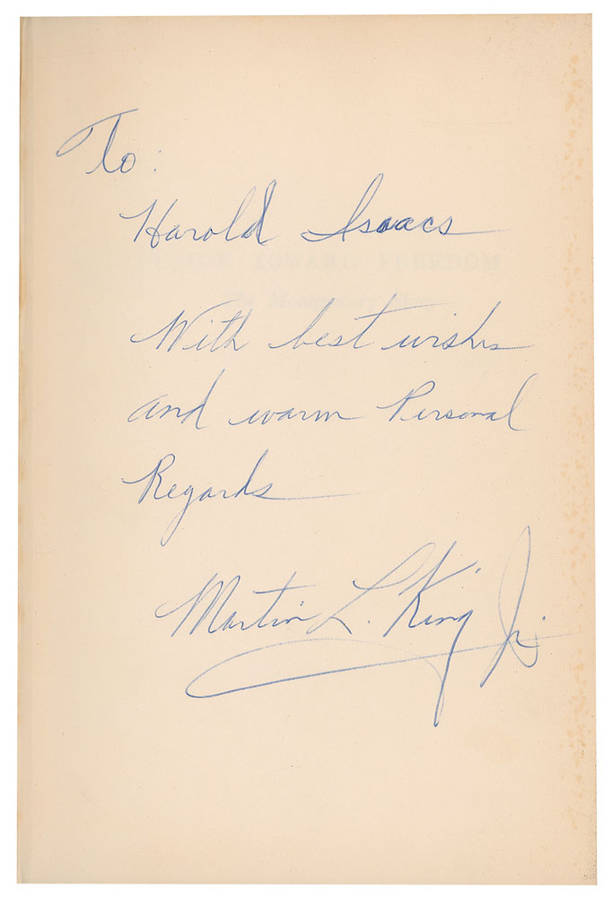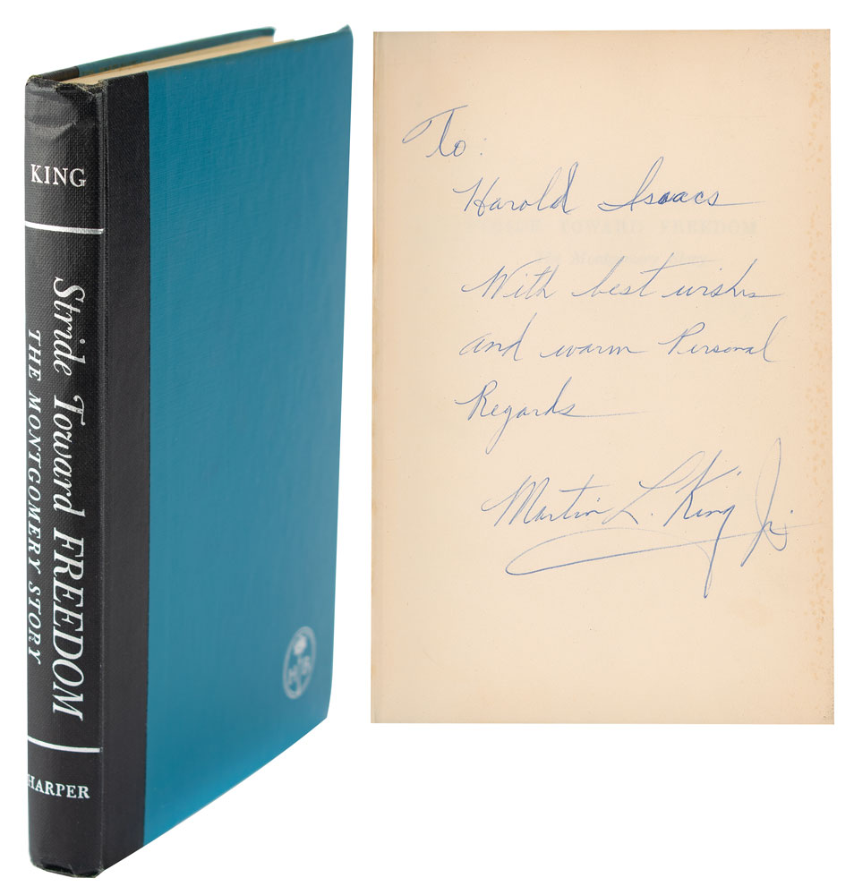 Signed book: Stride Toward Freedom: The Montgomery Story. First edition. NY: Harper & Brothers, 1958. Hardcover with dust jacket, 5.75 x 8.25, 230 pages. Signed and inscribed on the first free end page in blue ballpoint, "To: Harold Isaacs, With best wishes and warm personal regards, Martin L. King, Jr." Included are a Harper & Bros. advance review copy slip and publicity portrait. Autographic condition: fine. Book condition: VG/VG, with some foxing and edge nicks to the dust jacket.