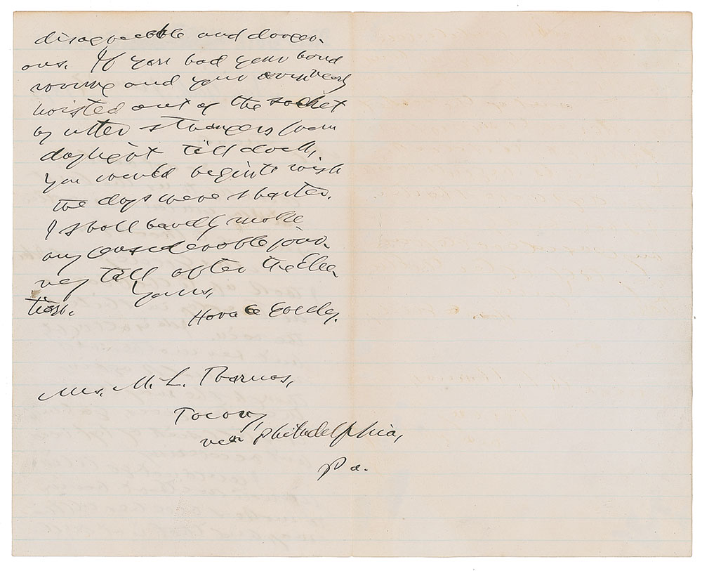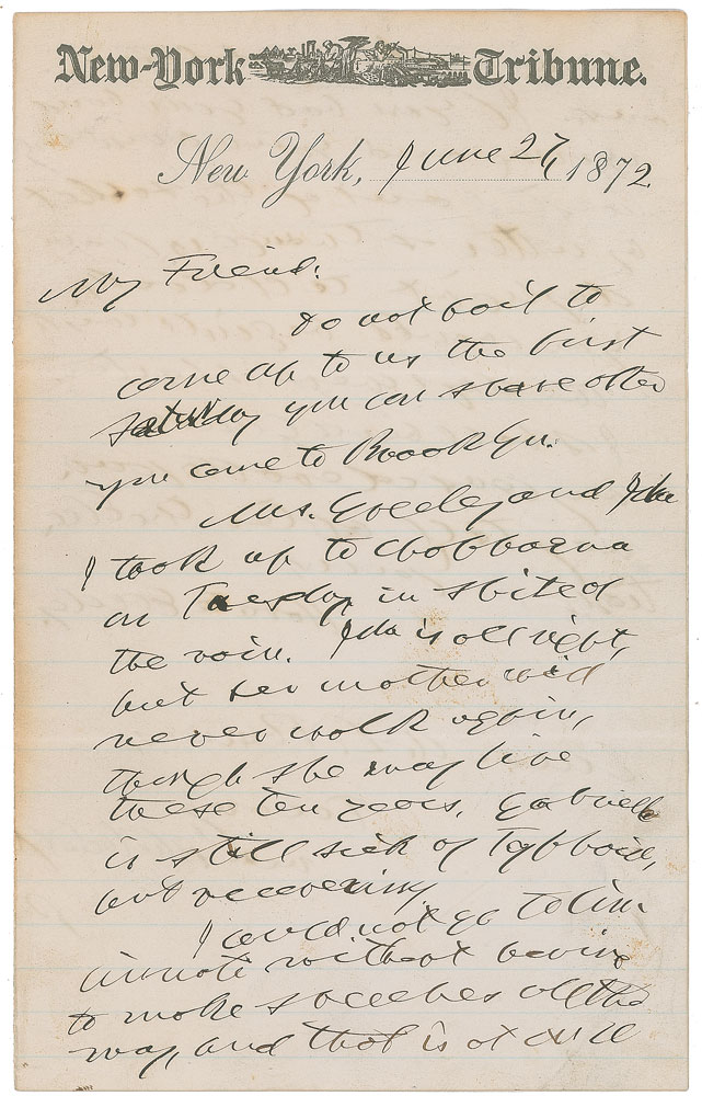 ALS, one page both sides, 5 x 8, New-York Tribune letterhead, June 27, 1872. Letter to a friend in Pennsylvania, inviting her to come to Brooklyn and providing updates on the health of his family. In fine condition, with some light soiling.