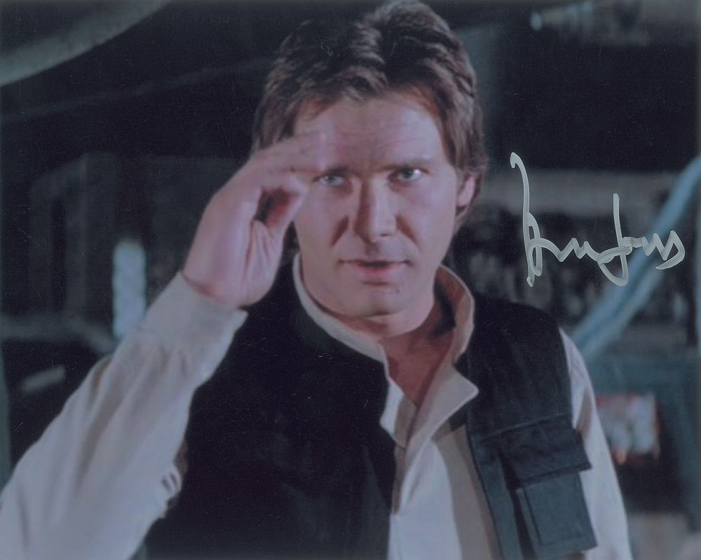 Choice color satin-finish 10 x 8 photo of Harrison Ford as Han Solo in Star Wars, nicely signed in silver ink. In very fine condition.