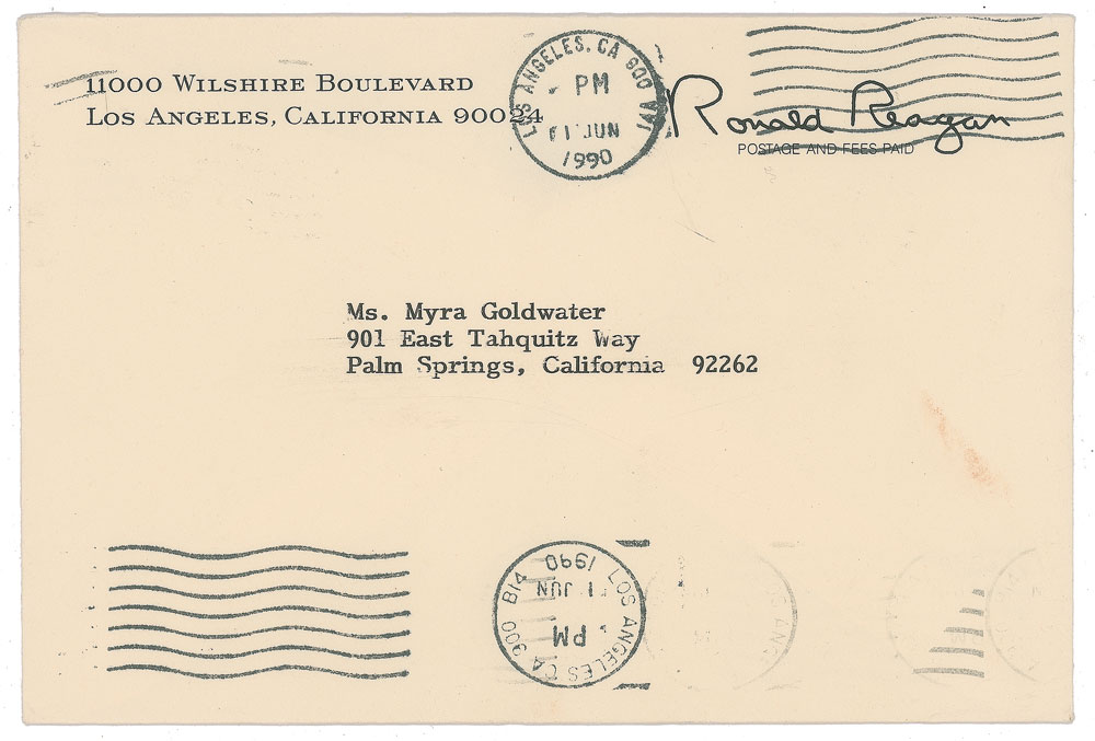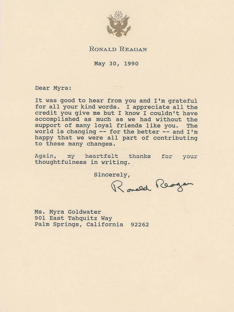 TLS, one page, 6.25 x 8.5, personal letterhead, May 30, 1990. Letter to Myra Goldwater, in part: "I appreciate all the credit you give me but I couldn't have accomplished as much as we had without the support of many loyal friends like you. The world is changing—for the better—and I'm happy that we were all part of contributing to these many changes." In fine condition. Accompanied by the original mailing envelope.