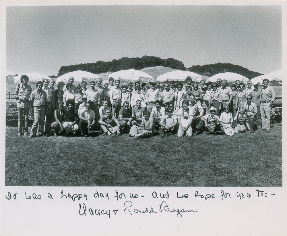 Glossy 10 x 8.25 photo of Ronald and Nancy Reagan, just left of center, posing outdoors with a large group of people, signed in the lower border in thin black felt tip, "It was a happy day for us—and we hope for you too—Nancy &" and "Ronald Reagan." In very good to fine condition, with scattered light creasing, and a short tear to the top edge. Accompanied by a full letter of authenticity from JSA.