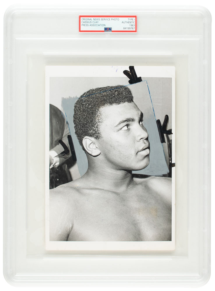 Original vintage circa 1963 glossy 10 x 8 silver gelatin photo of Cassius Clay prior to his first heavyweight bout with Henry Cooper at Wembley Stadium. Reverse bears an affixed caption, noting: "Clay, well-known for his boastings, claims he will finish the fight (in his own favour) in the fifth round. He would be proven correct: the fight, held on June 18, 1963, was stopped by the referee two minutes into the fifth round, and Clay was declared the winner." In very good to fine condition, with scattered light creasing. Encapsulated by PSA as an authentic 'Type I' photograph.