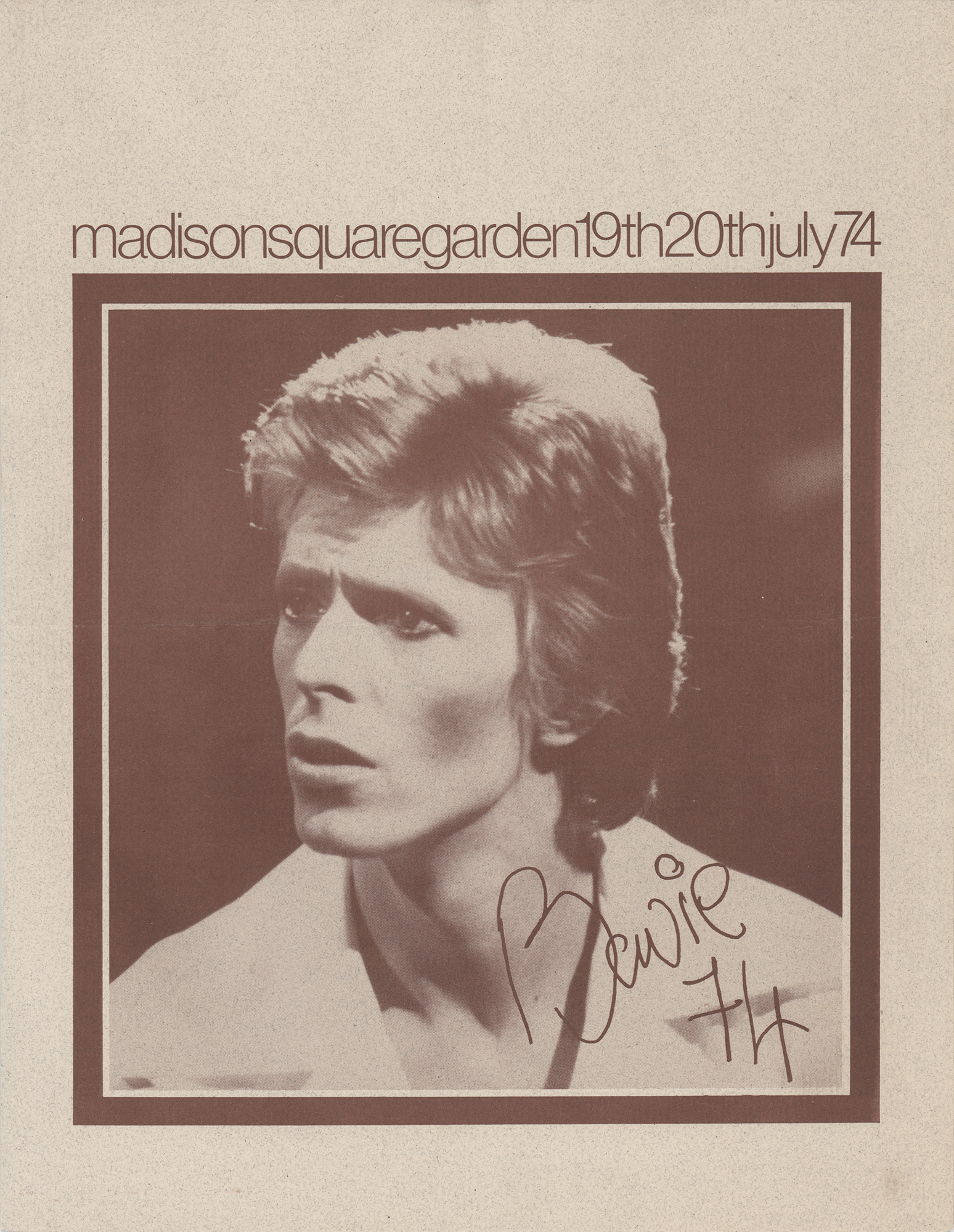 Original program for David Bowie’s two-night concert showcase at Madison Square Garden in New York City on July 19 and 20, 1974, as part of the Diamond Dogs Tour, 8.5 x 11, two pages, with interior featuring band and production credits. In very good to fine condition, with intersecting folds.
