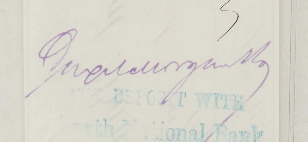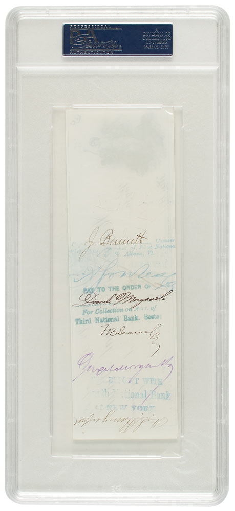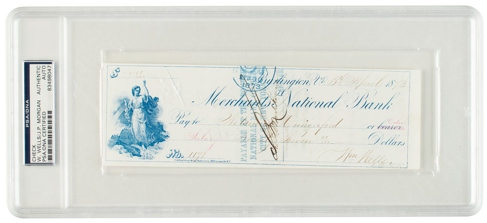 Merchants National Bank check, 8.25 x 2.75, filled out in another hand and signed by William Wells, "Wm Wells," payable to Nelson S. Hungerford for $77.50, April 5, 1873. Endorsed on the reverse in ink, "Pierpoint Morgan." In fine condition. Encapsulated in a PSA/DNA authentication holder.