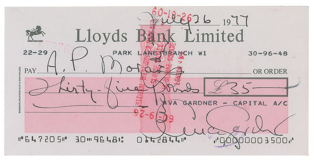 Lloyds Bank Limited check, 6 x 3, filled out and signed by Ava Gardner, payable to A. P. Moraz for £35, July 26, 1977. In fine condition.