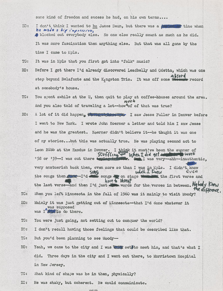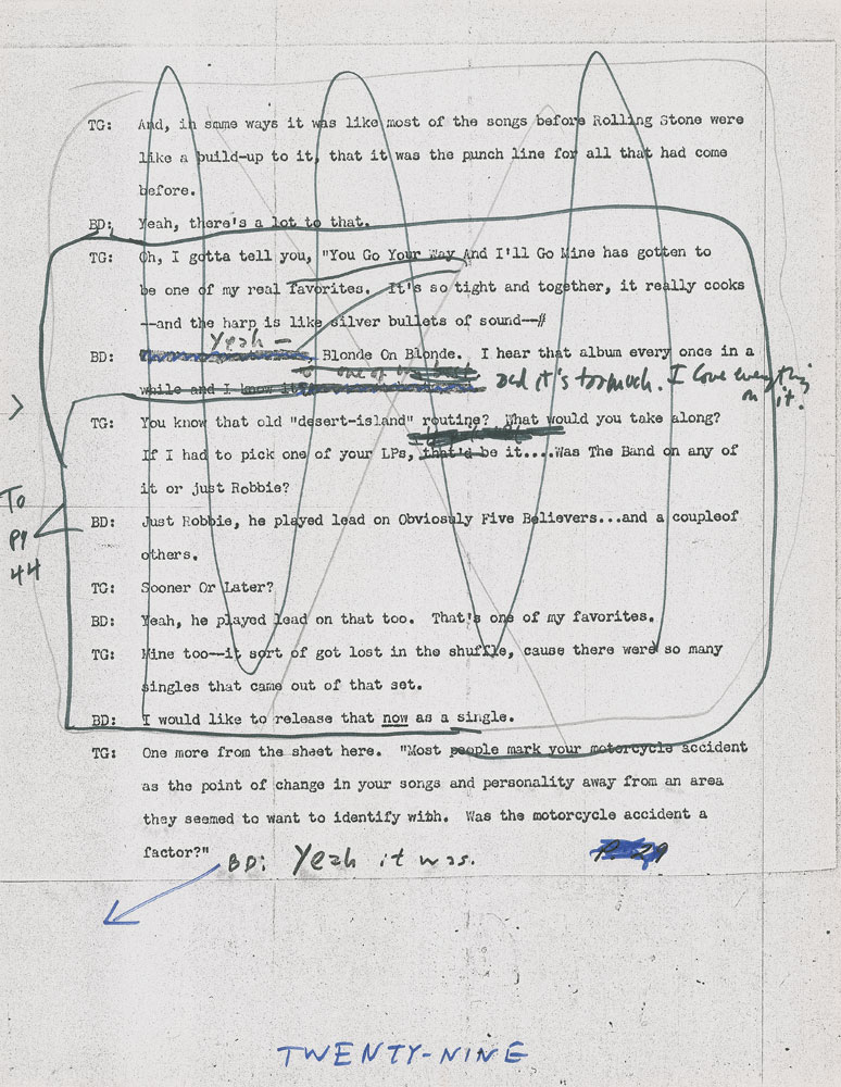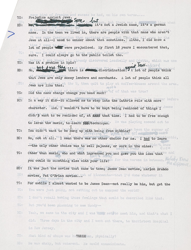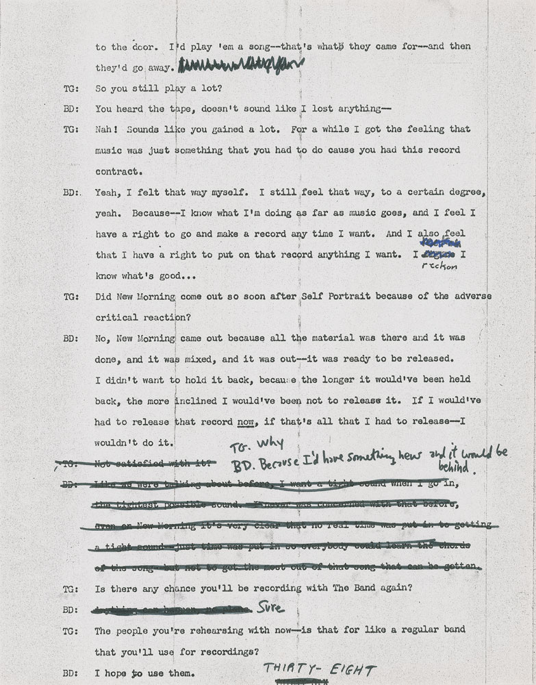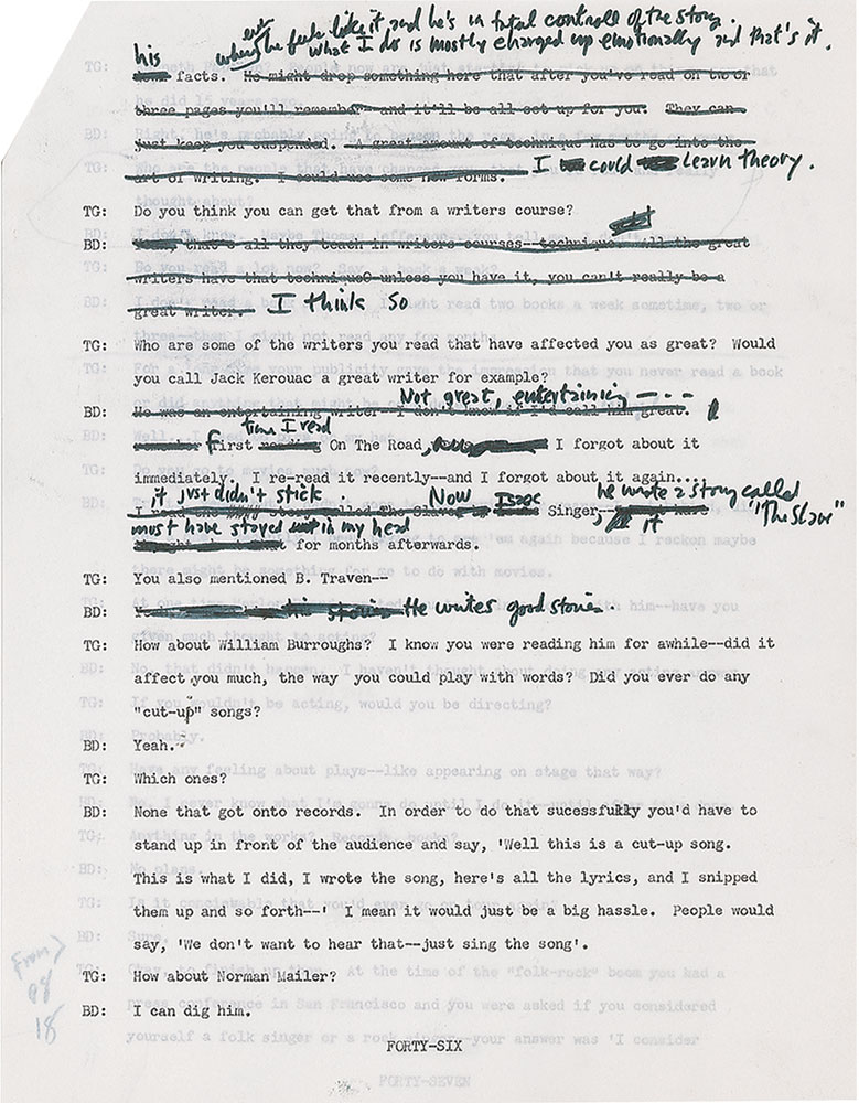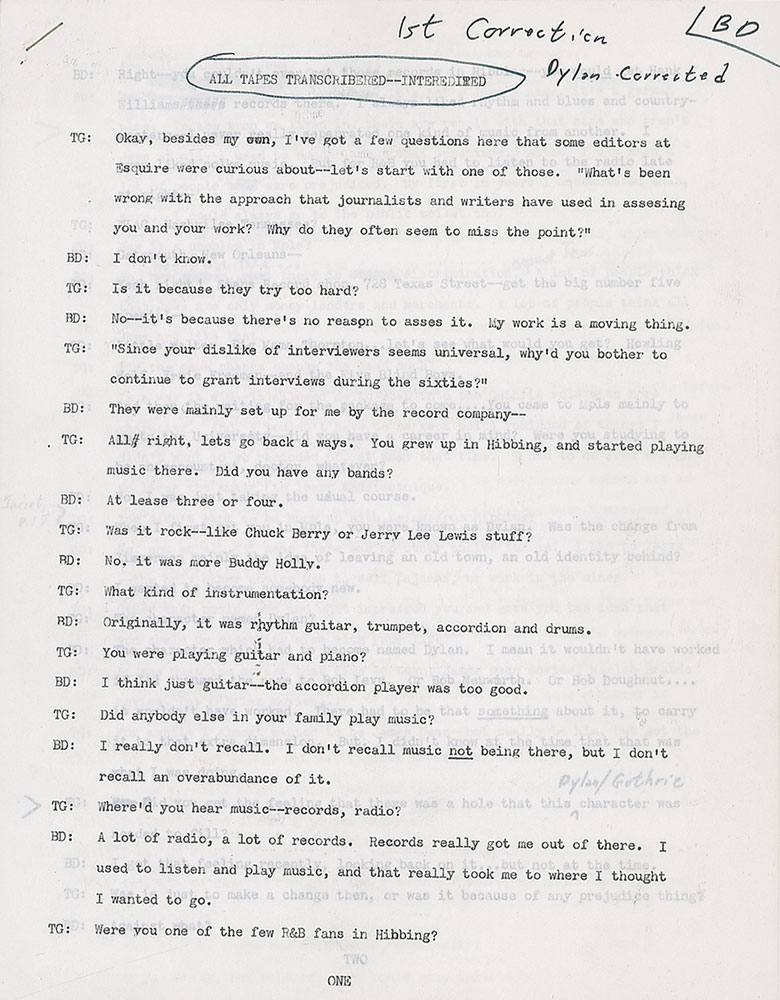 Typed/photocopied transcript of Bob Dylan's 1971 interview with Tony Glover, 47 pages, 8.5 x 11, annotated throughout in black felt tip by Dylan. Headed "All Tapes Transcribed—Interedited," the transcript incorporates changes made by Dylan in previous edits, and boasts original handwritten revisions intermixed with photocopied annotations from previous iterations. The upper right corner is annotated in black felt tip by Tony Glover: "BD, 1st Correction, Dylan Corrected." Primarily using black felt tip, Dylan makes original corrections to about 21 pages—sometimes changing a single word, other times prolifically deleting and rewriting questions and responses. Glover also makes a few corrections to the text.