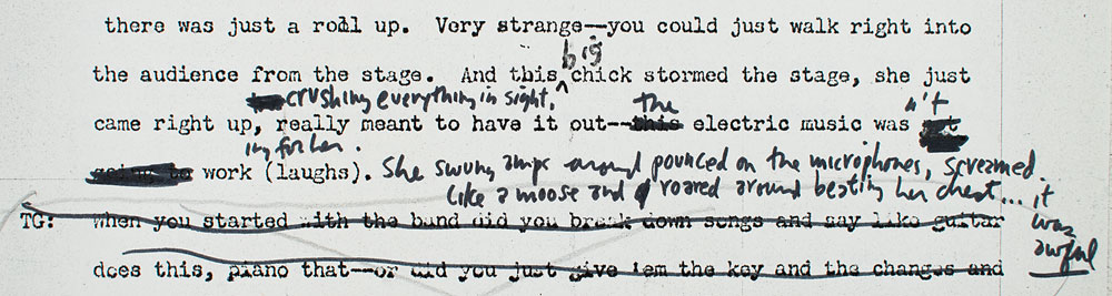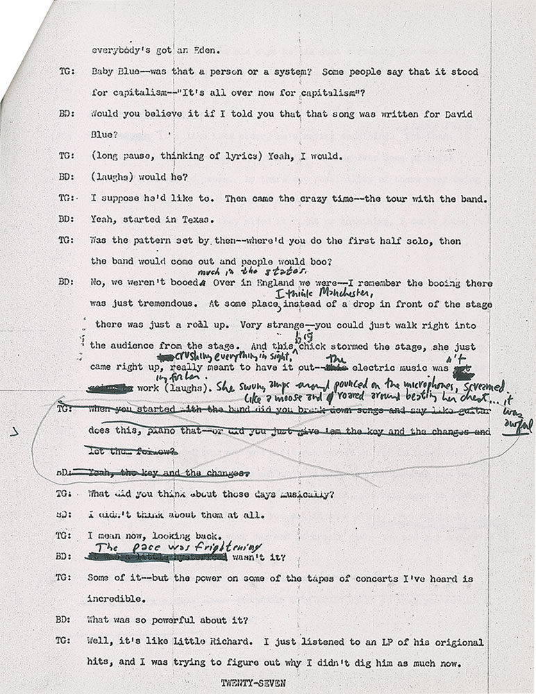 Representing an early draft of the complete interview, the topics covered here are wide ranging—from growing up in Hibbing to being booed at Newport and beyond. Most interesting are the revisions Dylan makes to the text: he revises a passage about prejudice against Jews, early performances where he knew the first and last verses but 'invented' what was in between ("Nobody knew the difference"), comments on the 'gay lib' movement ("They're not bothering anybody"), and writes an unknown story of the infamous 1966 'Judas' concert in Manchester, revising the quote to read: "At some place, I think Manchester, instead of a drop in front of the stage there was just a roll up. Very strange—you could just walk right into the audience from the stage. And this big chick stormed the stage, she just came right up, crushing everything in sight, really meant to have it out—the electric music wasn't working for her (laughs). She swung amps around pounced on the microphones, screamed like a moose and roared around beating her chest. It was awful." He goes on to make other substantial revisions to some passages about reading and writing literature, noting that teaching himself the basics of writing is "really tough," and says Jack Kerouac is "not great, entertaining." In fine condition.