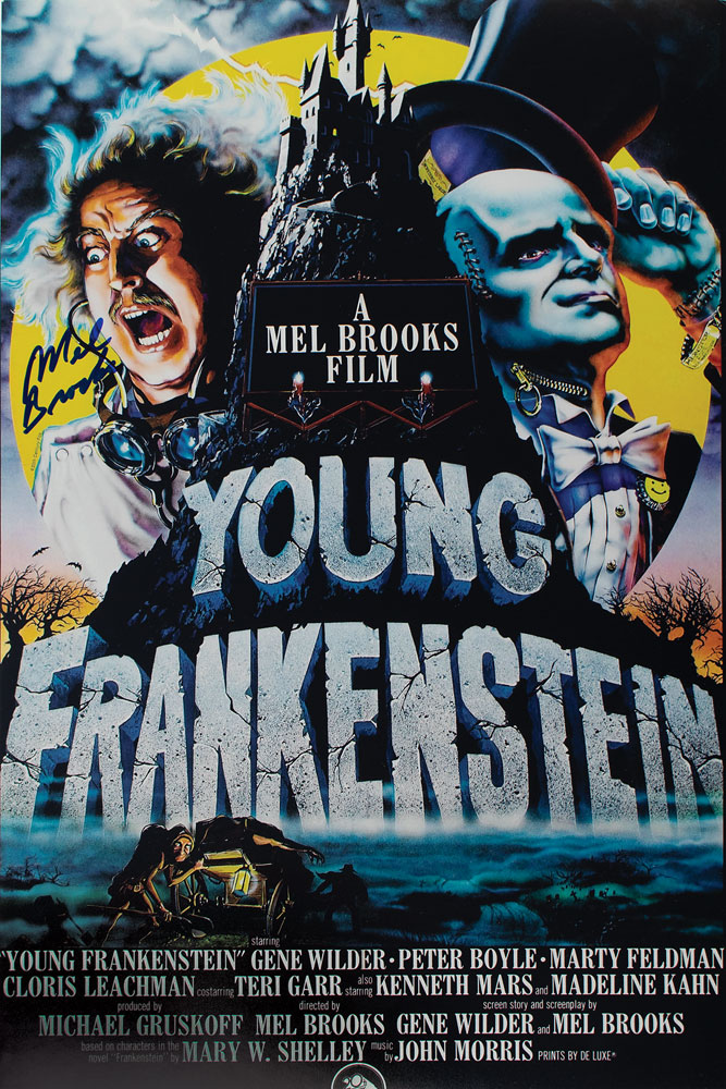 Color satin-finish 12 x 18 photo of the movie poster for the 1974 film Young Frankenstein, signed in blue felt tip by Mel Brooks. In fine condition. Originally obtained by in-person specialist Mike Wehrmann.