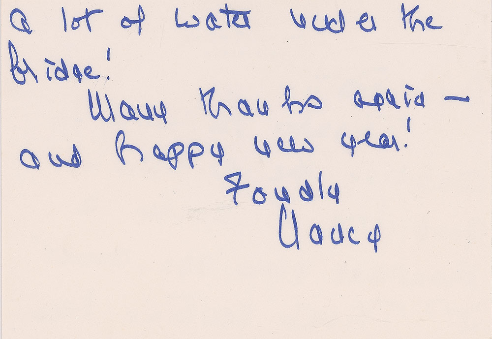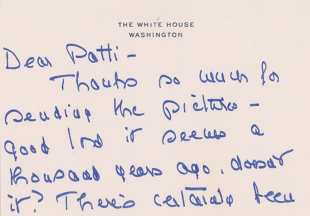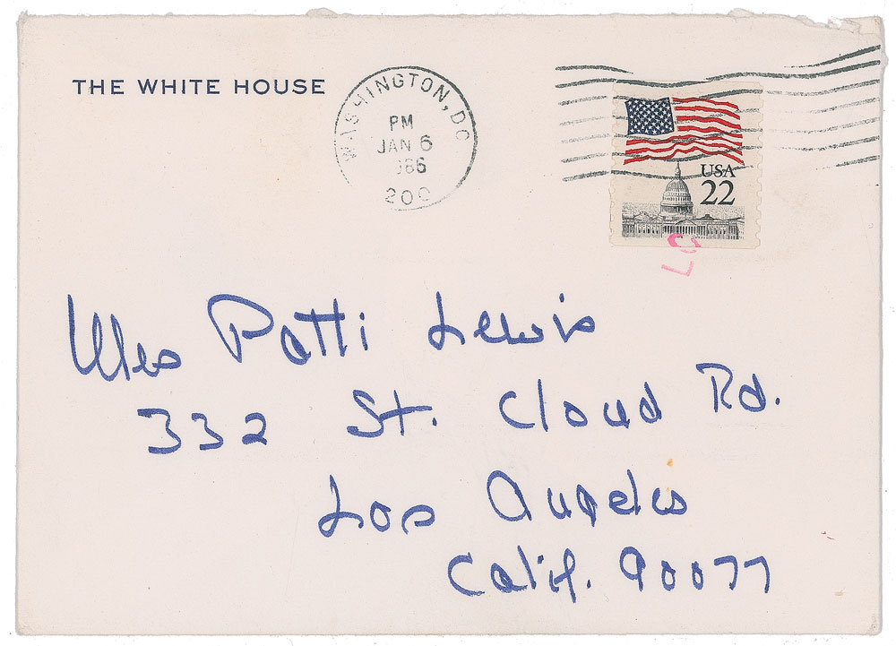 ALS as first lady signed “Nancy,” one page both sides, 5 x 3.5, White House stationery, January 6, 1986. Letter to Patti Lewis, the first wife of comedian Jerry Lewis, in full: "Thanks so much for sending the pictures—good lord it seems a thousand years ago, doesn't it? There's certainly been a lot of water under the bridge! Many thanks again—and happy new year!" In very fine condition. Accompanied by the original mailing envelope.