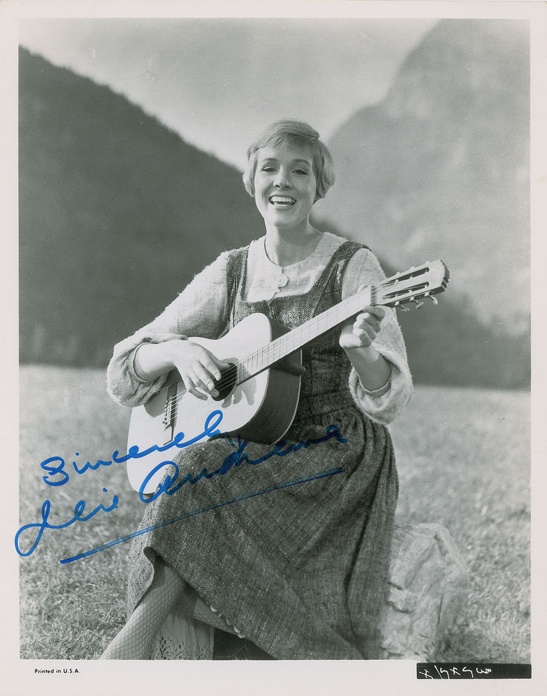 Wonderful glossy 8 x 10 photo of Julie Andrews as Maria von Trapp from the 1965 musical drama The Sound of Music, signed in blue felt tip, "Sincerely, Julie Andrews." In fine condition, with a light crease to the upper left corner, and a paperclip impression to the top edge.