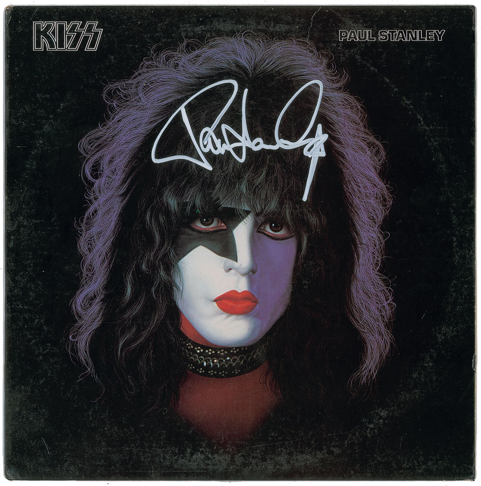 Complete set of four solo albums released by the members of KISS on September 18, 1978, each signed on the front cover in either white paint pen or silver ink by the pictured musician: Gene Simmons, Peter Criss, who adds a drum sketch, Paul Stanley, and Ace Frehley, who adds a playing card and galaxy sketch. In overall fine condition, with light scuffing. The records are not included. The grouping is accompanied by a full letter of authenticity from REAL.