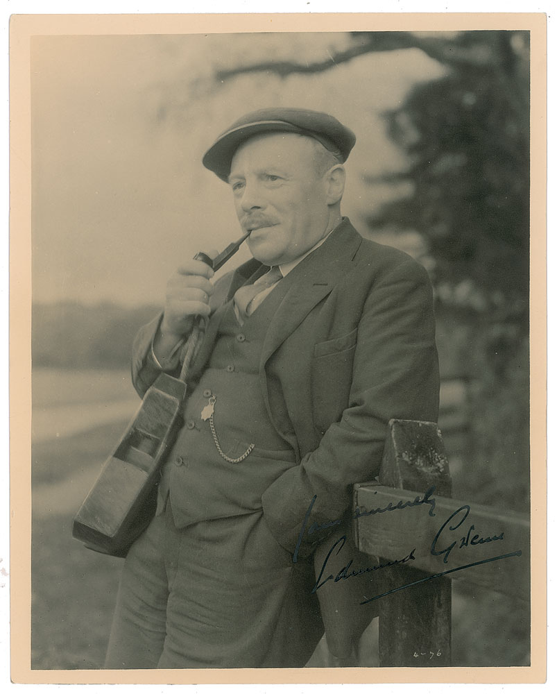 Vintage matte-finish 7.75 x 9.75 photo of the actor smoking a pipe, signed in fountain pen, "Yours sincerely, Edmund Gwenn." Reverse bears a Gaumont-British Picture Corporation copyright stamp. In fine condition.