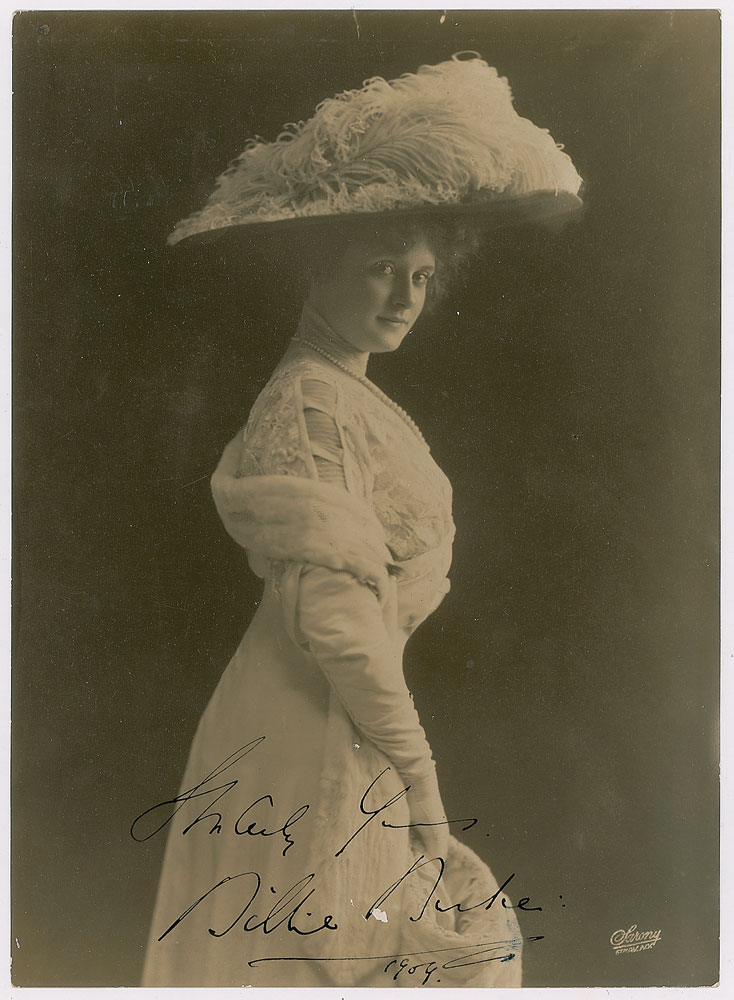 Vintage glossy 6.75 x 9.25 photo of Burke by Sarony, signed and inscribed in ink, "Sincerely yours, Billie Burke, 1909.” In fine condition, with a fleck of emulsion loss touching the first letter of Burke's last name.