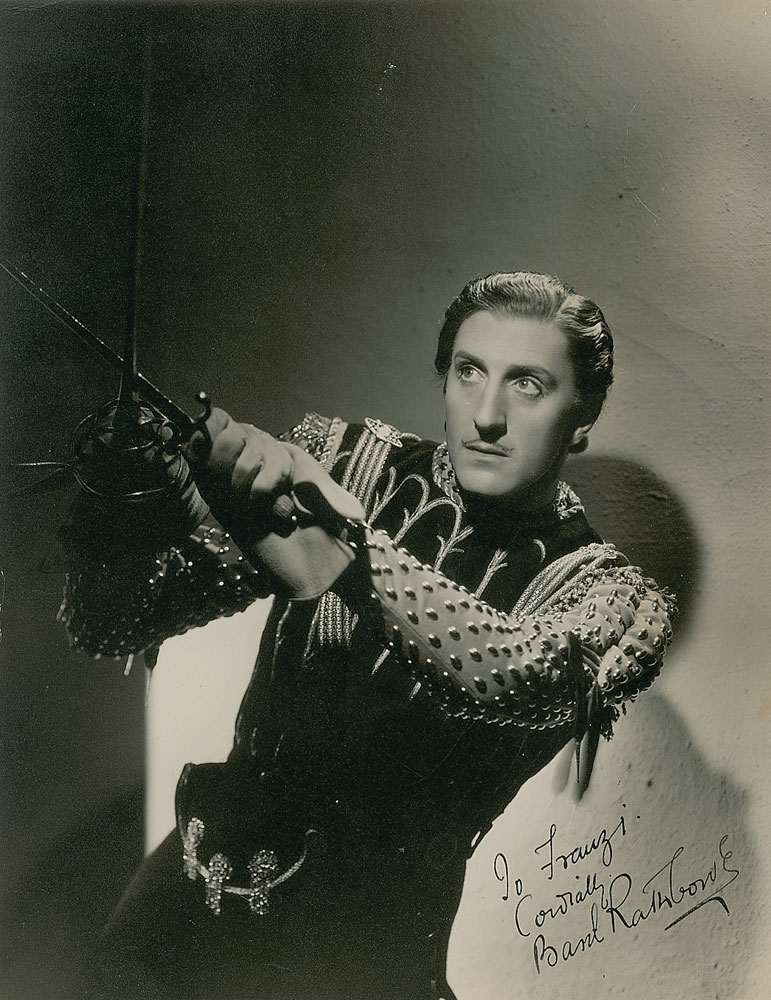 Exceptional vintage matte-finish 10 x 13 photo of Rathbone as Tybalt in Romeo and Juliet, boldly signed and inscribed in fountain pen, "To Franzi, Cordially, Basil Rathbone.” Reverse bears an MGM/Clarence Sinclair Bull credit stamp. In very good to fine condition, with a crease to the upper right background area, and an area of thin paper to the right edge due to mounting removal.