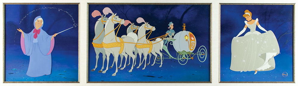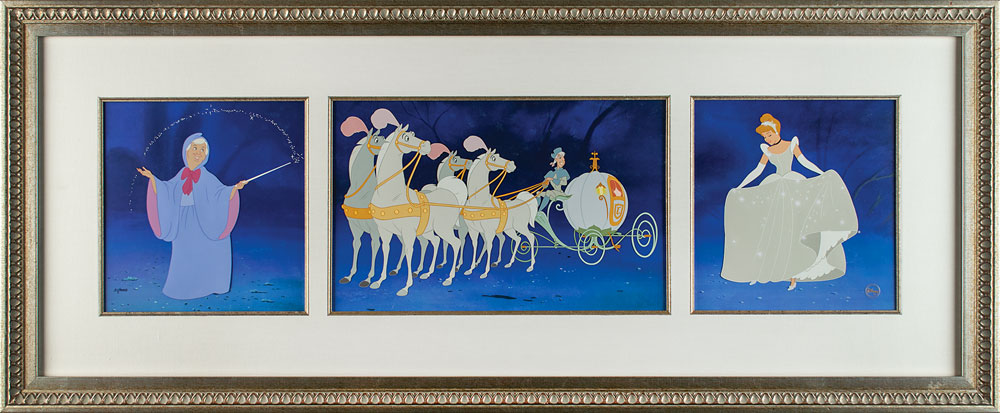 (Walt Disney Studios, 1997) Original limited edition hand-painted cels entitled 'Cinderella's Magic Night,' numbered 51/400, showing her Fairy Godmother, the elegant pumpkin-turned-carriage, and Cinderella in her sparkling gown. Framed to an overall size of 48 x 20. The piece has the silver Walt Disney Company seal to lower right. In fine condition. Accompanied by a certificate of authenticity from Disney Enterprises, Inc.