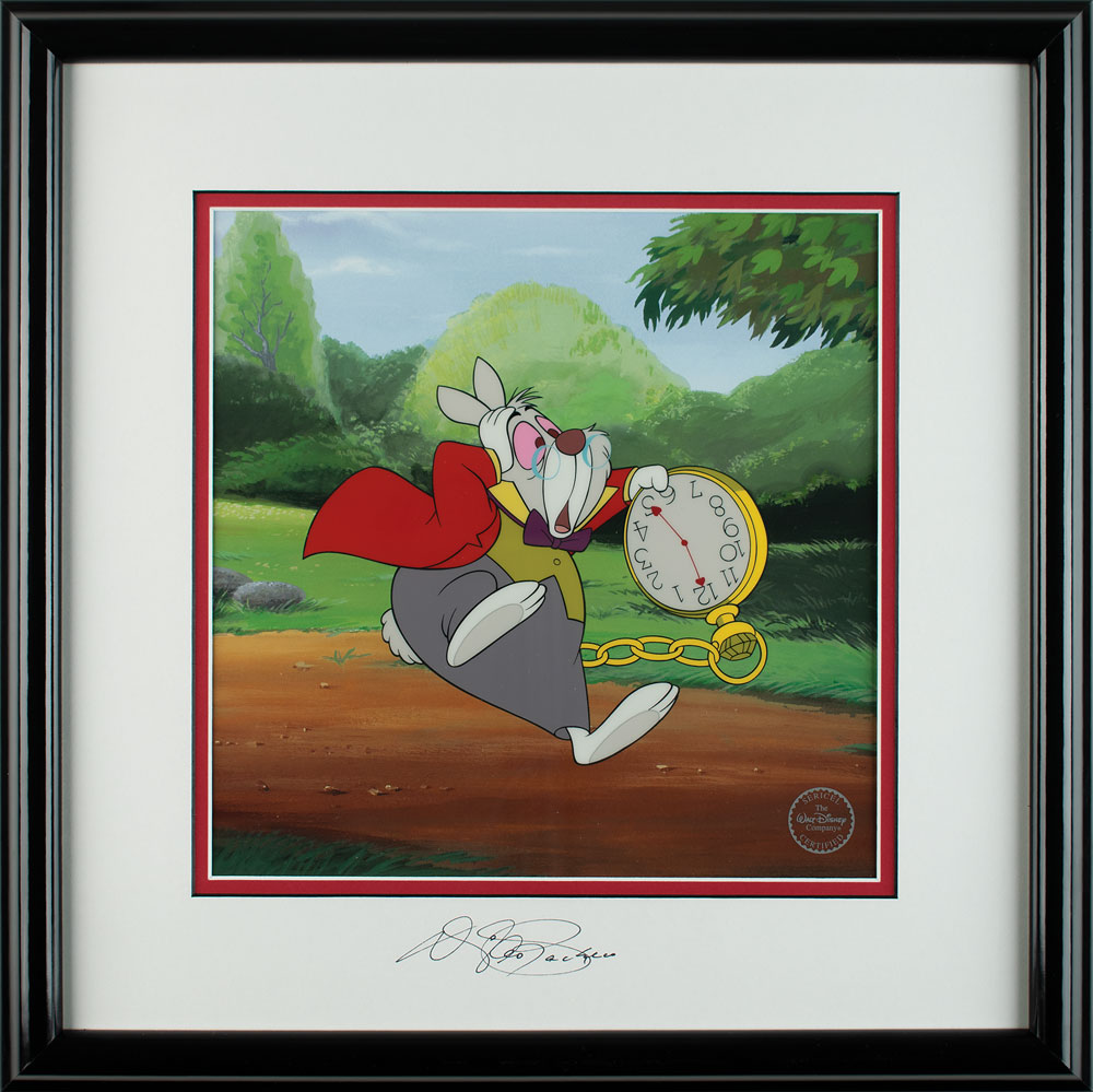 (Walt Disney Studios, 1999) Limited edition sericel entitled 'I'm Late,' released in a signed edition of 1500, showing the White Rabbit from Alice in Wonderland holding his big pocket watch. Double-matted and framed to an overall size of 16.5 x 16.5, and signed on the mat in black felt tip by Disney artist and art director Dave Pacheco. In fine condition. Accompanied by a certificate of authenticity from The Walt Disney Company.