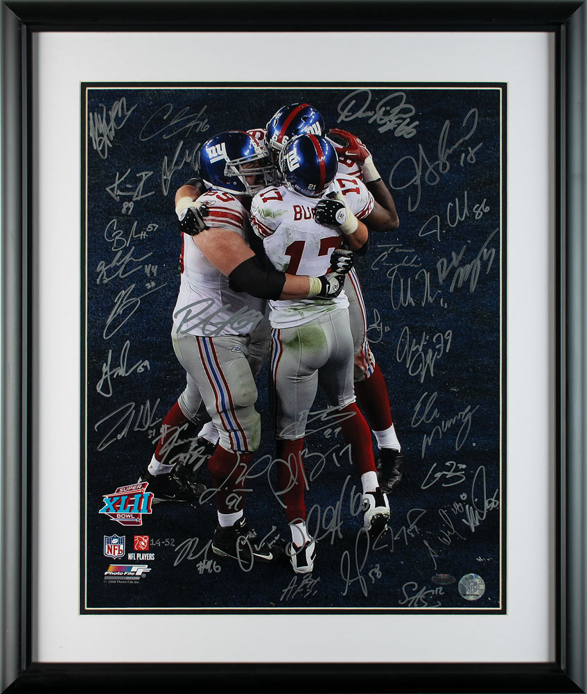 Limited edition color glossy 15.5 x 19.5 photo of the New York Giants celebrating Plaxico Burress's game-winning touchdown in Super Bowl XLII, numbered 14/52, signed in silver ink by 34 members of the team: Eli Manning, Kevin Boss, Plaxico Burress, Tom Coughlin, James Butler, Adam Coates, Barry Cofield, Reuben Droughns, Madison Hedgecock, Antonio Pierce, Aaron Ross, Chase Blackburn, Gibril Wilson, Gerris Wilkinson, Zak DeOssie, Craig Dahl, Jeff Feagles, Jerome Collins, David Diehl, R.W. McQuarters, Justin Tuck, Sean O'Hara, Ahmad Bradshaw, Steve Smith, Chris Snee, Rich Seubert, Jay Alferd, Kawika Mitchell, Kareem McKenzie, Jared Lorenzen, Michael Strahan, Brandon Jacobs, Amani Toomer, and Osi Umenyiora. Double-matted and framed to an overall size of 22 x 26. In fine condition. Accompanied by a certificate of authenticity from Steiner Sports.
