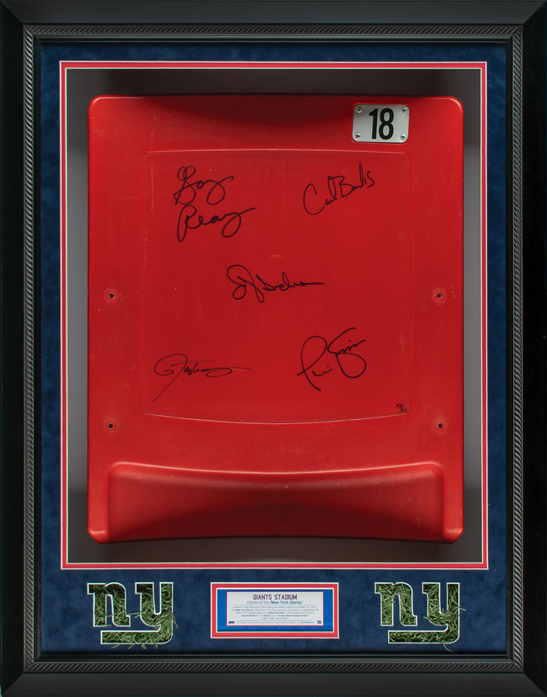 Original red seatback from Giants Stadium, released in a limited edition and numbered 93/100, signed in black felt tip by Lawrence Taylor, Phil Simms, Carl Banks, O. J. Anderson, and Gary Reasons. Handsomely displayed in a shadowbox with original turf from Giants Stadium to an overall size of 26 x 32. In fine condition, with a chipped corner to the shadwbox. Accompanied by a certificate of authenticity from Steiner Sports.
