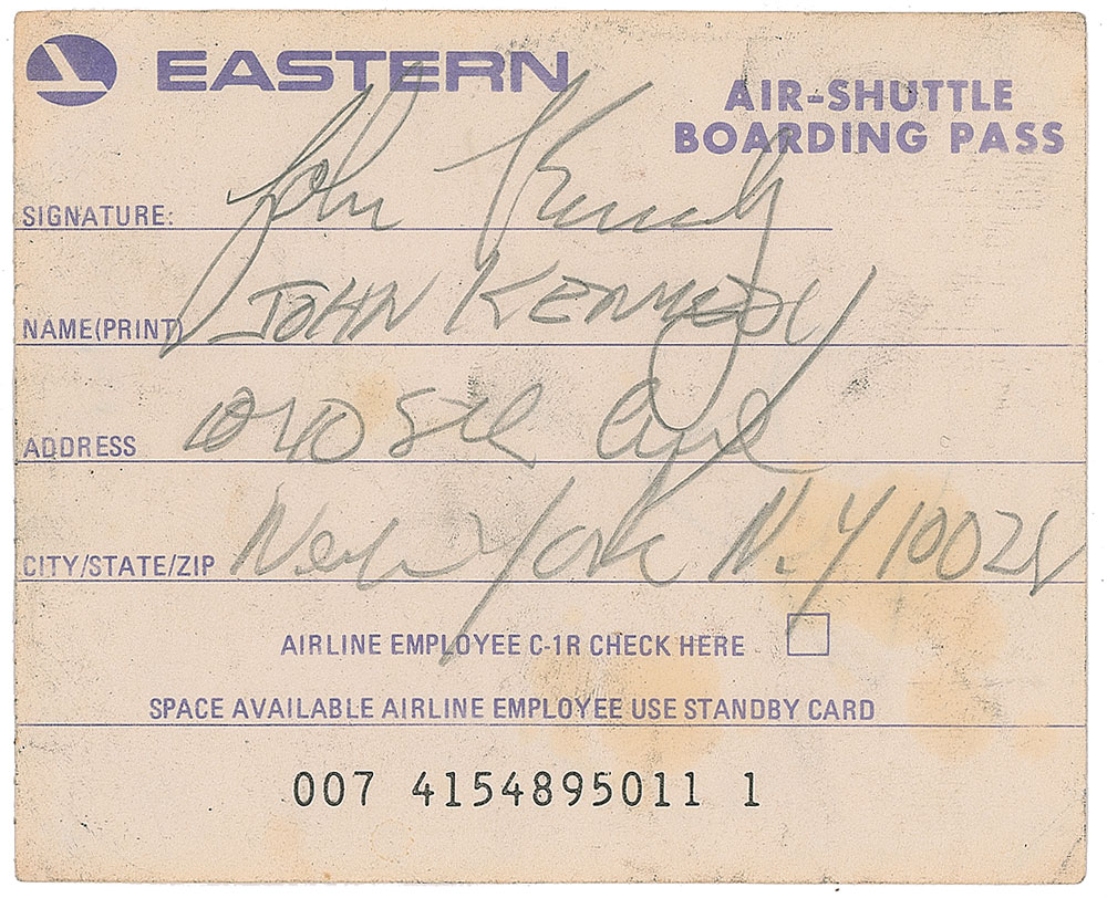 Eastern Air Lines air-shuttle boarding pass, 4 x 3.25, filled out and signed in pencil by John F. Kennedy, Jr., with his signature, printed name, and address: "John Kennedy, John Kennedy, 1040 5th Ave, New York N.Y. 10028." In very good to fine condition, with light staining.
