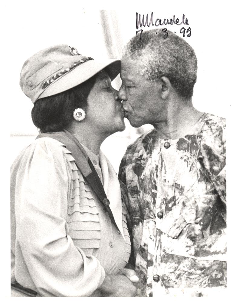 Glossy 8 x 10 photo of Nelson Mandela kissing his wife Winnie, signed in black felt tip, "N. Mandela, 7.3.93." In fine condition.