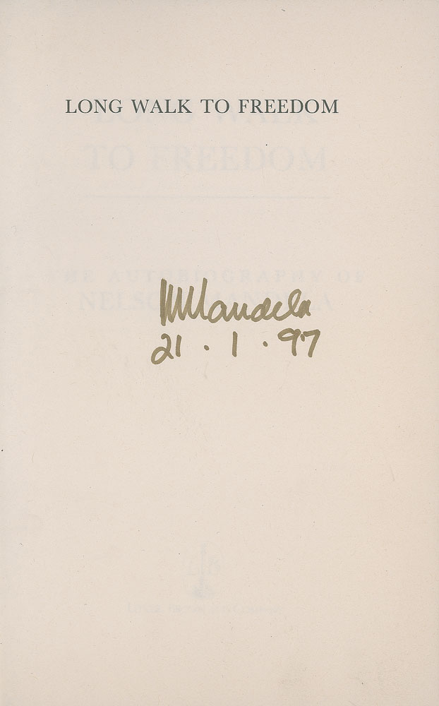 Signed book: Long Walk to Freedom. Later UK printing. London: Little, Brown and Company, 1994. Hardcover with dust jacket, 6.25 x 9.5, 630 pages. Signed on the half-title page in gold ink, "N. Mandela, 21.1.97." In fine condition, with wear, and a short tear, to the dust jacket.