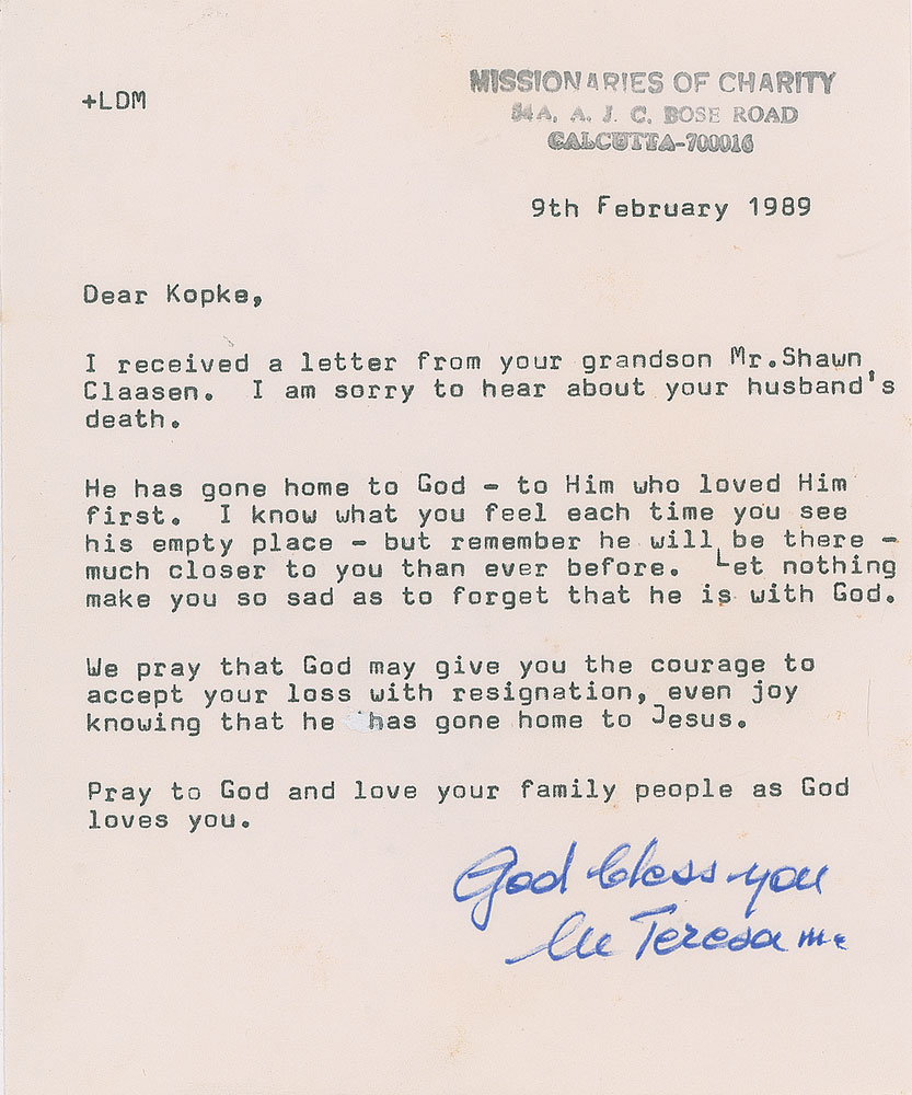 TLS signed “God bless you, M Teresa mc,” one page, 5.5 x 6.75, stamped Missionaries of Charity letterhead, February 9, 1989. Letter offering condolences and prayers, in part: "I am sorry to hear about your husband's death. He has gone home to God—to Him who loved Him first. I know what you feel each time you see his empty place—but remember he will be there—much closer to you than ever before. Let nothing make you so sad as to forget that he is with God." In fine condition. Accompanied by the original mailing envelope.