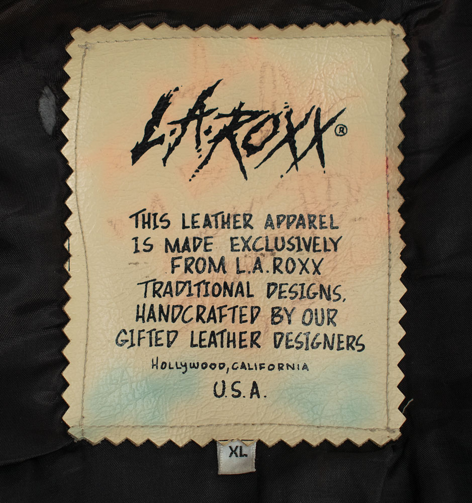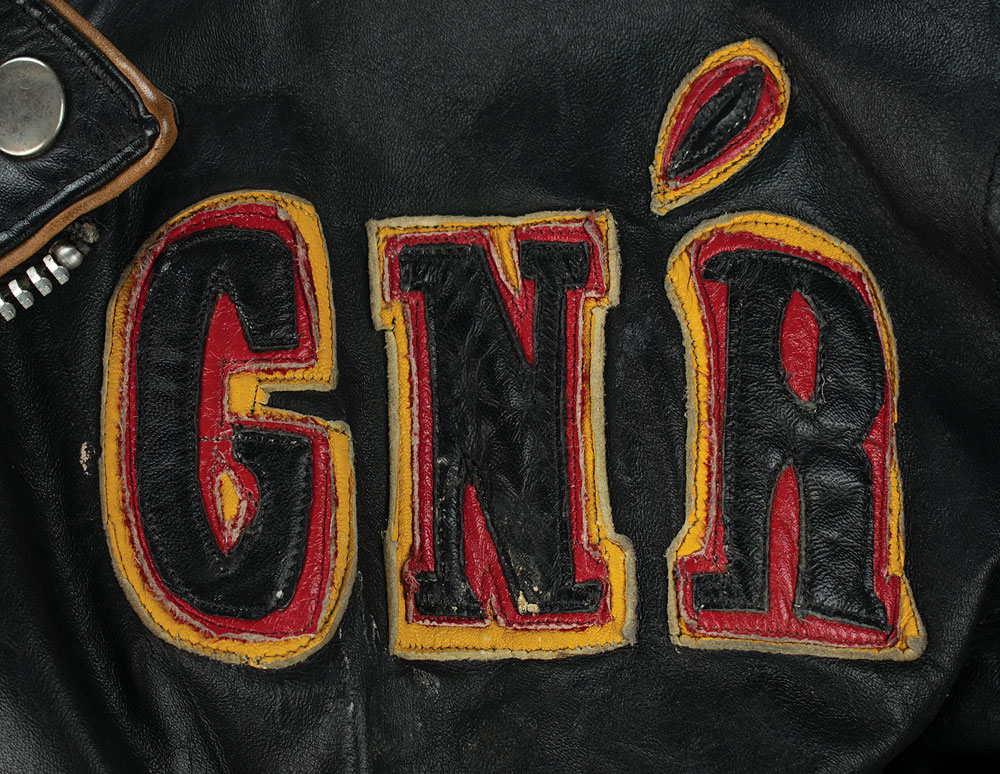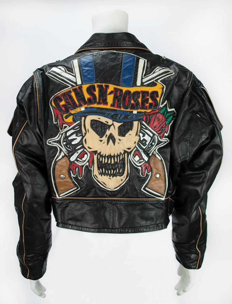 Mean-looking black leather Guns N' Roses biker-style tour jacket, size XL, with stylish designs and leather patchwork to the right sleeve, the left chest, and the back dominated with a large top hat-wearing skull with crossed pistols. Interior retains the original L. A. Roxx tag. In very good to fine condition, with scuffing to the left chest side and some tearing to inner cuff liners.