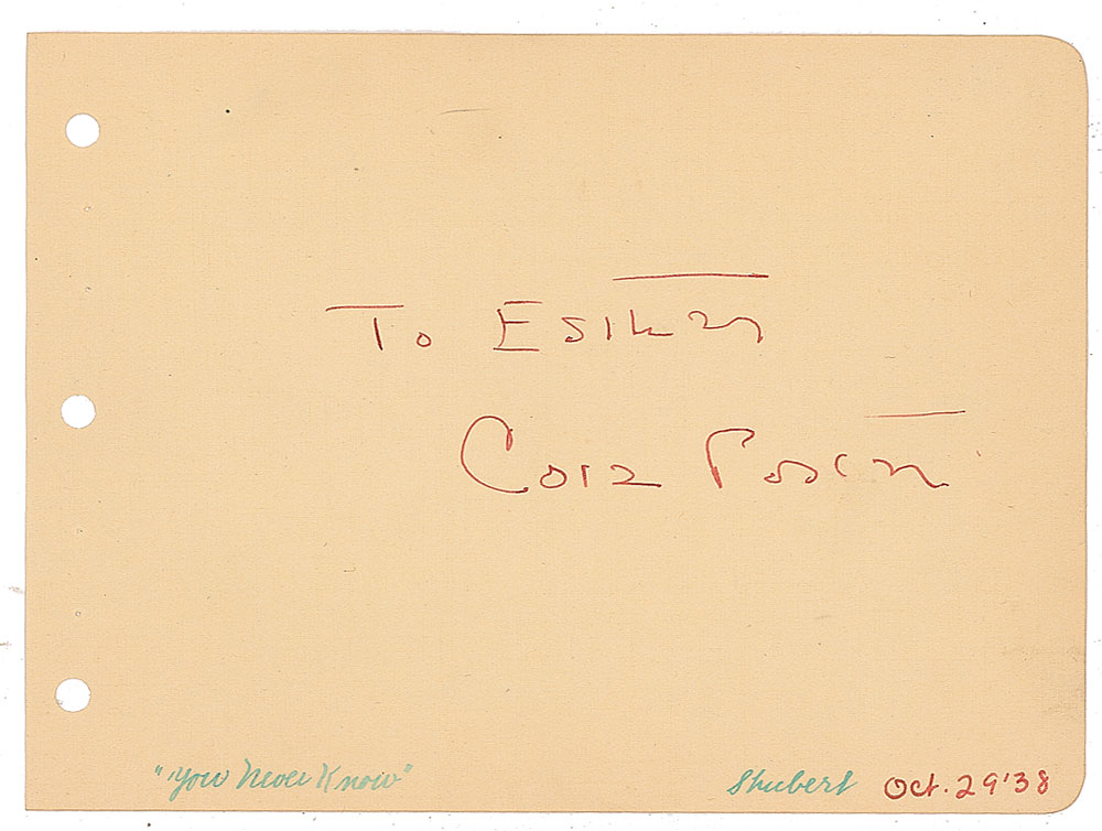 Vintage fountain pen signature and inscription, "To Esther, Cole Porter,” on an off-white 6 x 4.25 album page, with a collector's date notation of October 29, 1938, in the lower corner. In fine condition.
