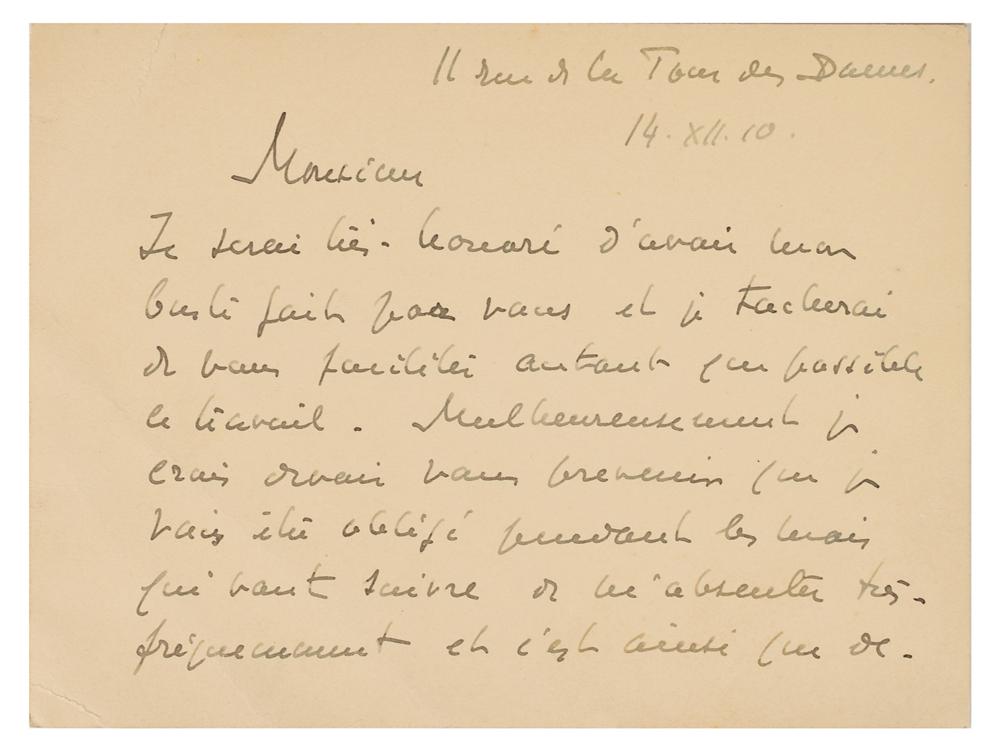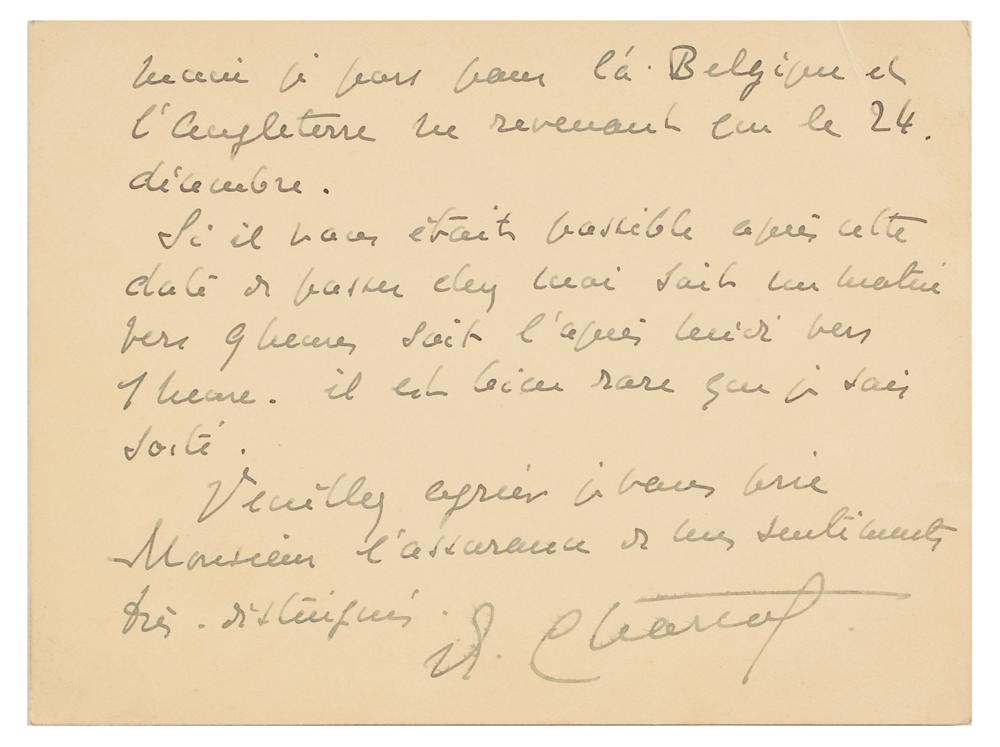 French polar explorer, scientist, and medical doctor (1867-1936), and the son of neurologist Jean-Martin Charcot. Untranslated ALS in French, signed “J. B. Charcot,” one page both sides, 5.5 x 4, December 14, 1910. In fine condition.